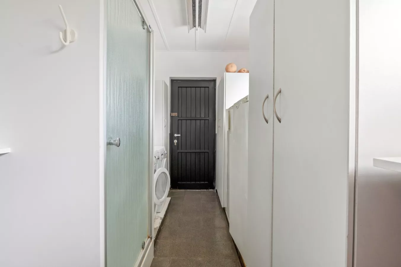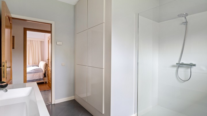 Loopt u in de inkomhal verder door, gaat deze over in de nachthal met vestiaire die toegang biedt tot de drie ruime slaapkamers (13,5 m² / 12 m² / 10,5 m²), de badkamer met inloopdouche, een volledig betegelde toiletruimte en tot slot de inpandige garage met automatische sectionaalpoort. Hier bevinden zich tevens de aansluitingen voor wasmachine en droogkast en ook de zolder is vanuit de garage bereikbaar via een luik met uitneembare trap. Naast de garage is er aan de rechterzijde ook nog een carport aanwezig met fietsenstalling.