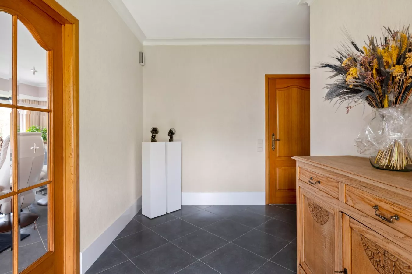 U komt binnen via de inkomhal. Meteen links leidt een dubbele deur u naar de open en lichtrijke woonkamer.