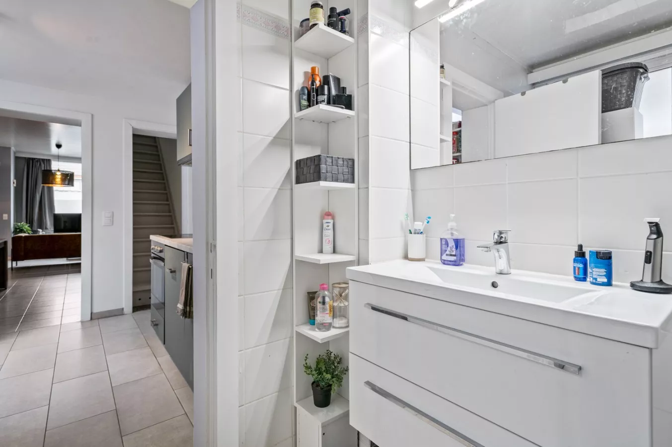 Op het gelijkvloers komt u de woning via de woonkamer binnen aangrenzend aan deze gezellige doch lichtrijke woonkamer is er de keuken die toegang geeft tot de badkamer en het terras.