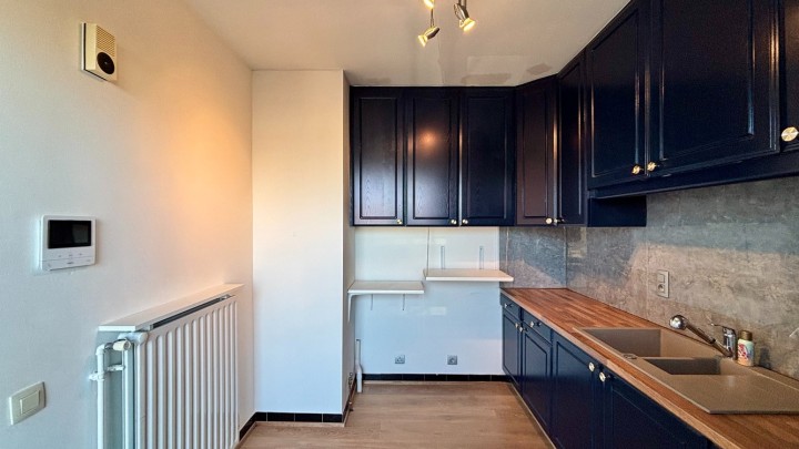 De ruime leefruimte is voorzien van een vernieuwde parketvloer, wat zorgt voor een warme en moderne uitstraling. Aansluitend bevindt zich de keuken die voorzien is van een oven, een inductievuur en een dubbele lavabo met verlek. Vanuit de keuken heeft u directe toegang tot het terras aan de voorzijde.