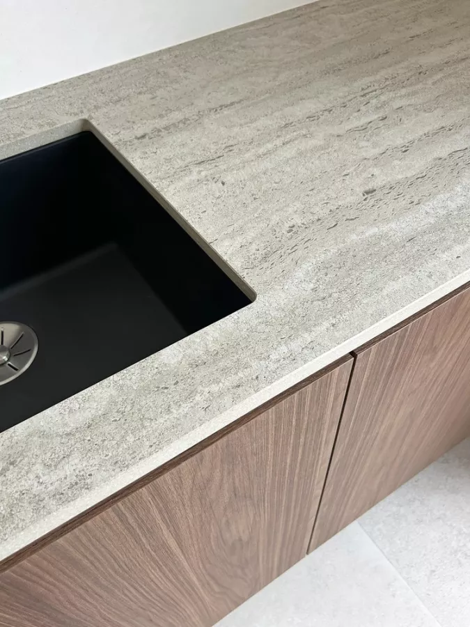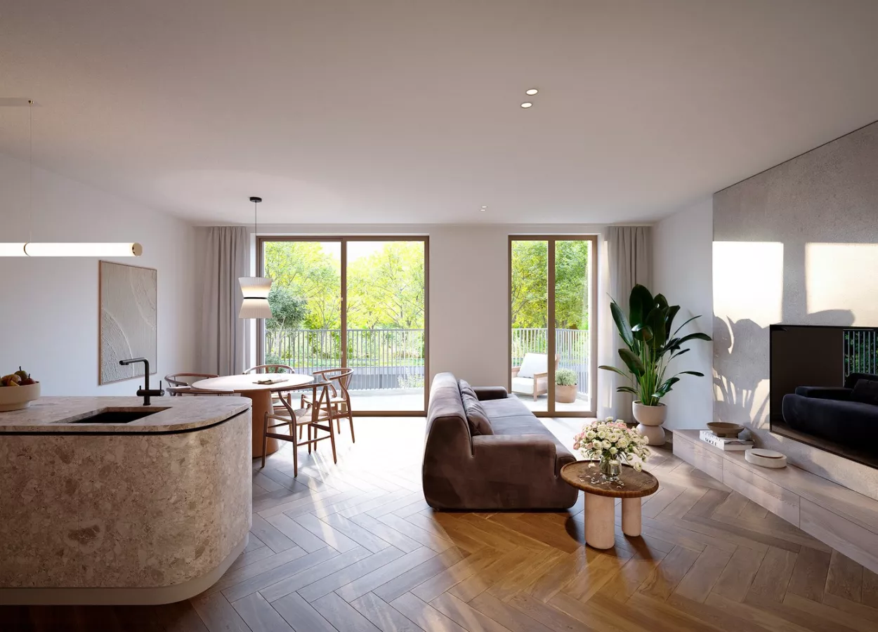 De woonkamer met open keuken vormt het hart van het appartement. De keuken is afgewerkt met fineerhouten fronten en een dekton werkblad, en uitgerust met kwalitatieve toestellen zoals een combi-oven, inductiekookplaat met geïntegreerde dampkap, vaatwasser en koelkast. Dankzij de grote raampartijen geniet de leefruimte van een aangename lichtinval en rechtstreeks toegang tot het zuidwestgericht terras.