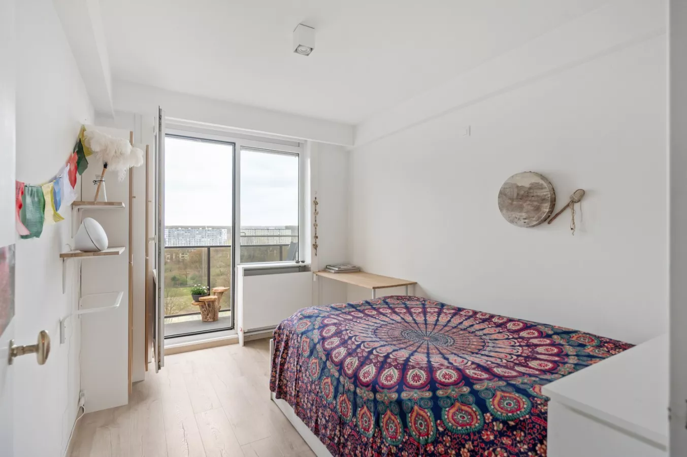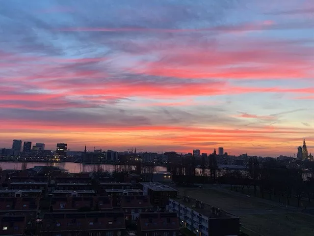 Het appartement geniet van een fantastisch panoramisch uitzicht op de skyline van Antwerpen! De living is gericht naar het Oosten, waar u kan genieten van een prachtige zonsopgang.