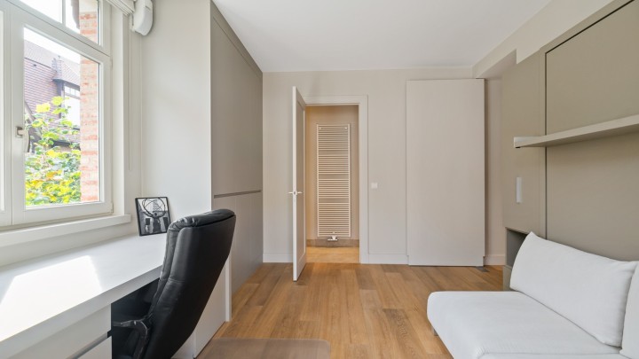 Verder is er een grote dressing (12m²) aanwezig met parketvloer, welke toegang geeft tot de eerste ruime slaapkamer (17,5m²) en de prachtige badkamer.