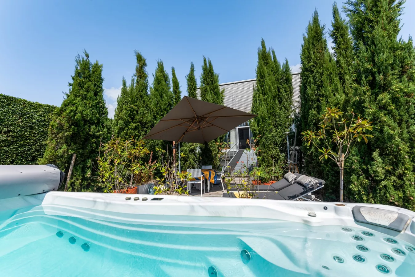 De prachtig aangelegde privatieve, zuid gerichte tuin, met terras, Jacuzzi (zwemspa) en sauna biedt absolute rust en privacy. Ideaal om te genieten samen met vrienden en familie.