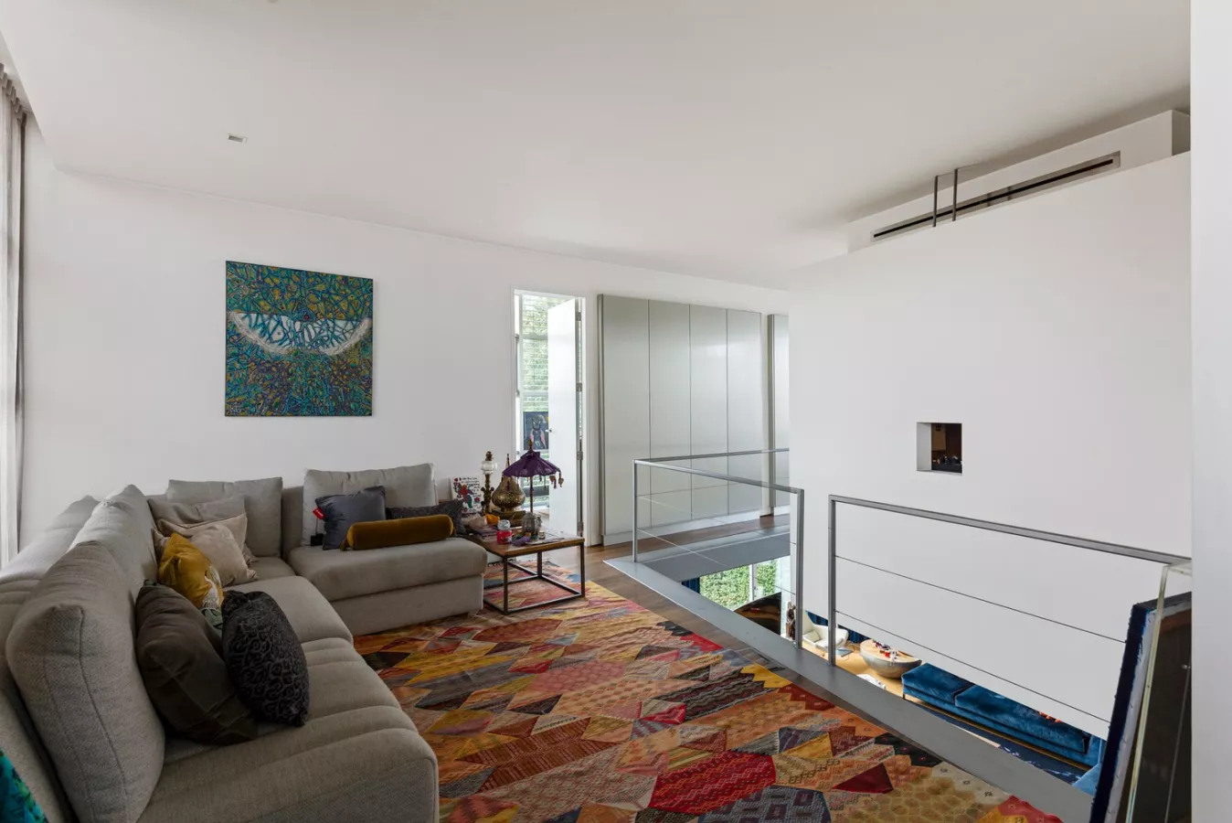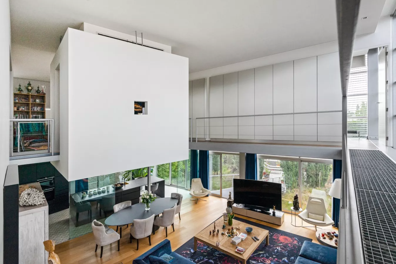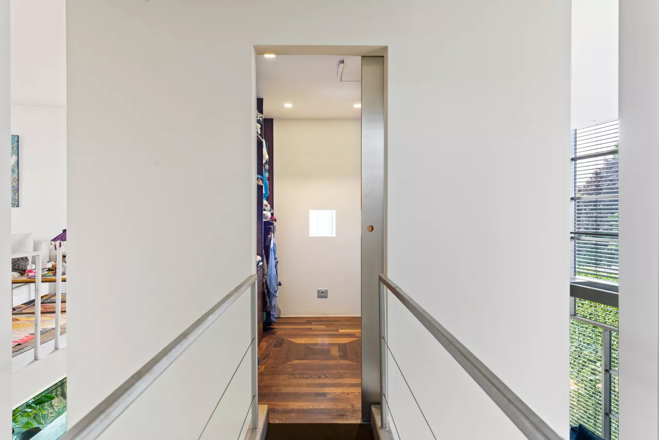 De inkomhal, met vestiaire en gastentoilet, brengt ons naar de adembenemende leefruimte. Zowel de leefruimte als de modern, volledig geïnstalleerde keuken baden in natuurlijk licht door de grote raampartijen en bieden een gevoel van openheid en rust. De schuiframen geven een naadloze overgang tussen binnen- en buitenleven.