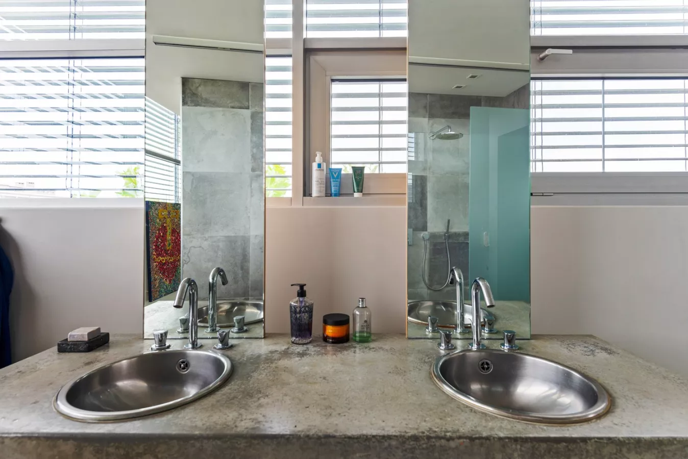 De badkamer is stijlvol ingericht met een dubbele lavabo in een modern badkamermeubel en een royale inloopdouche.