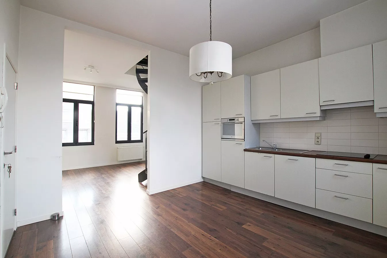 Dit mooie appartement beschikt over een leefruimte op parket met een volledig geïnstalleerde, open keuken.