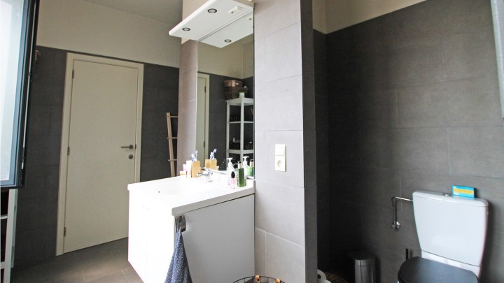 Verder bevindt er zich de badkamer met douche, enkele lavabo en toilet. Vervolgens treffen we een bergruimte met aansluiting voor een wasmachine.