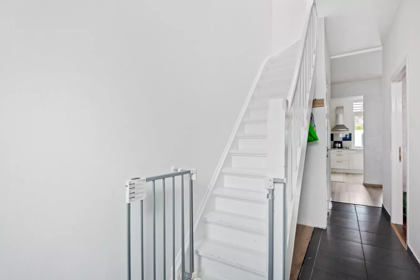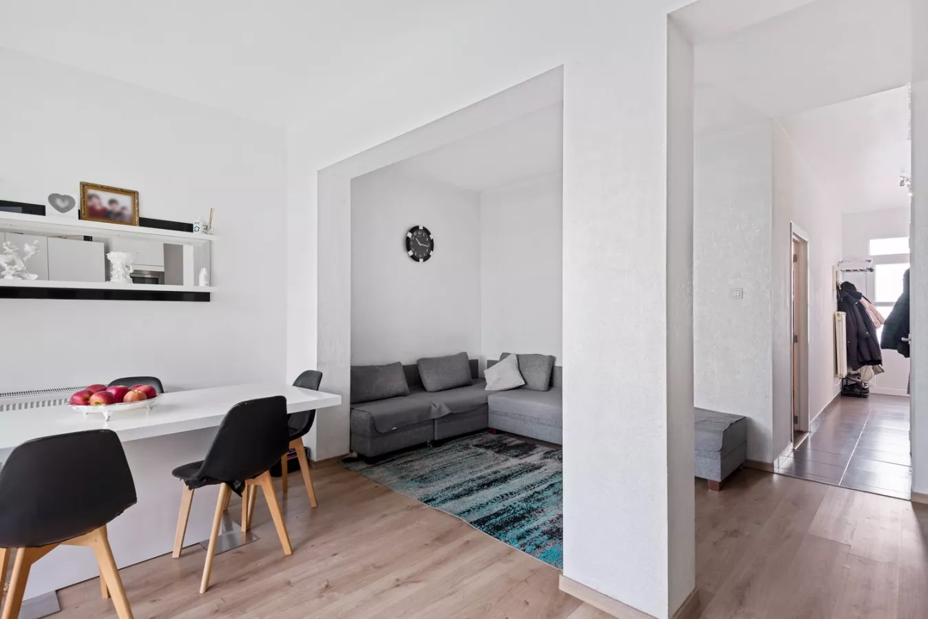 We betreden de woning via de inkomhal met apart toilet die toegang geeft tot de gezellige leefruimte die naadloos doorloopt naar de geïnstalleerde, open keuken.