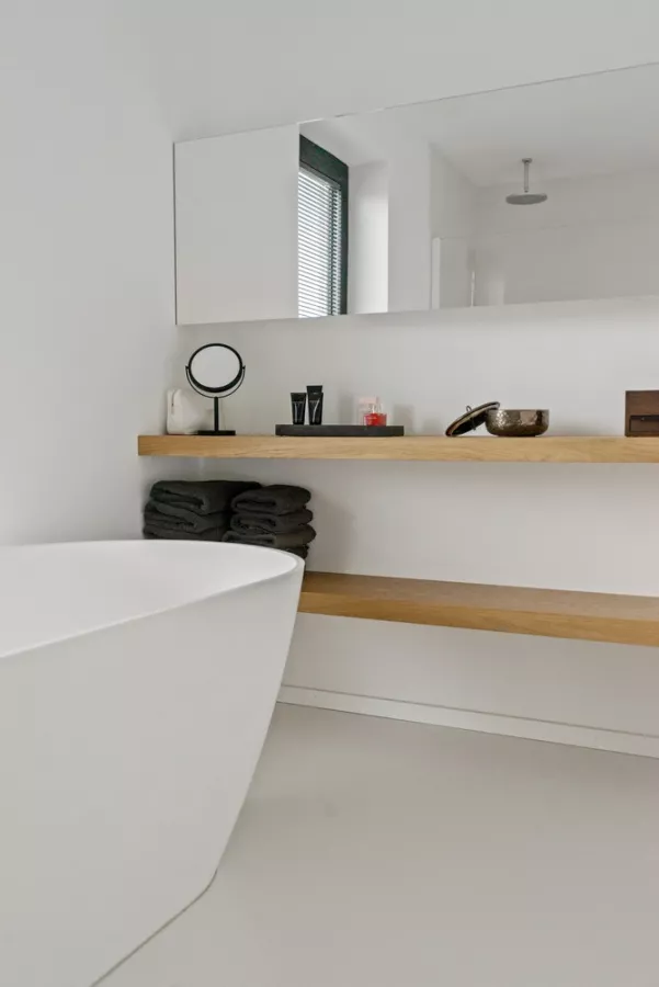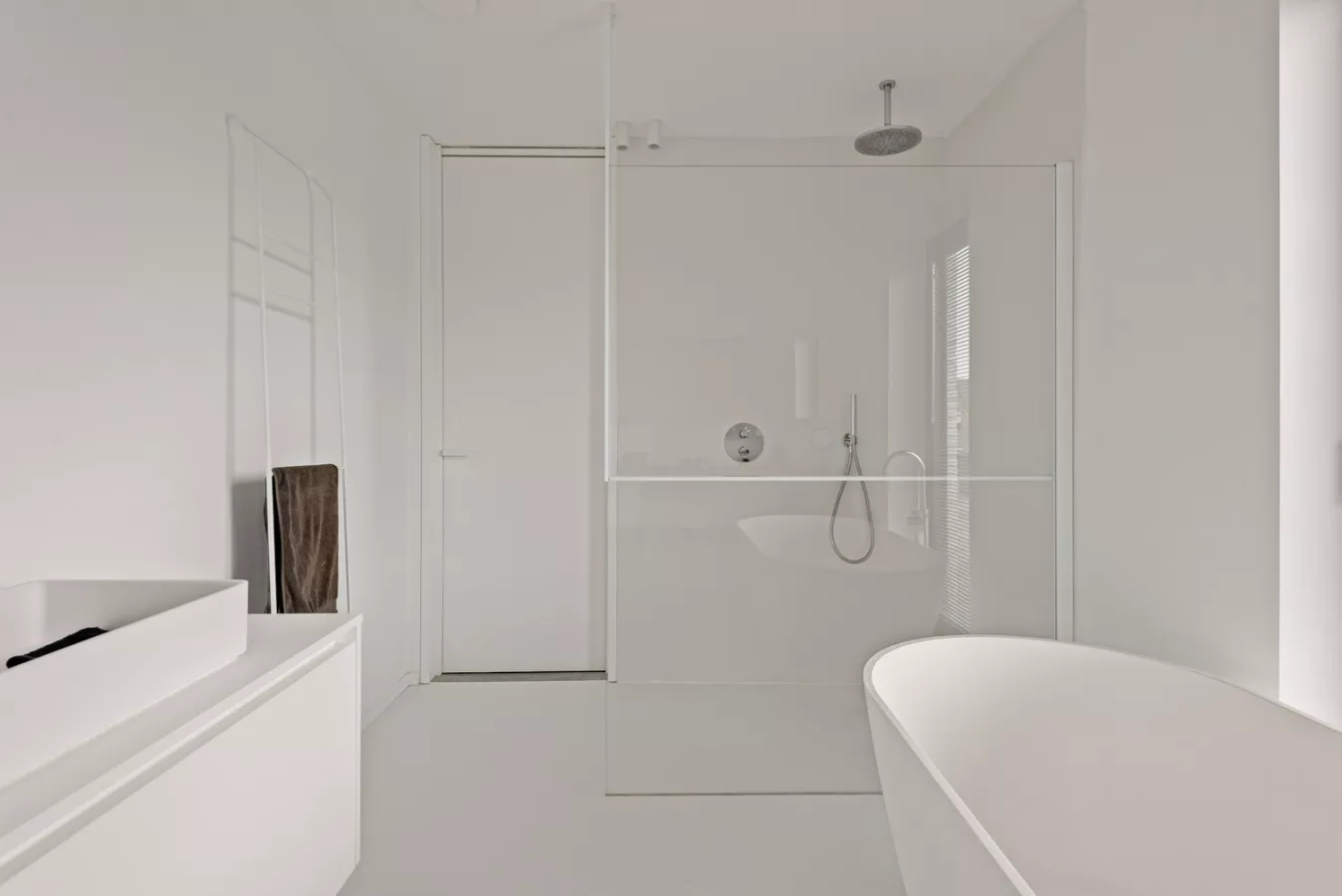 De badkamer is uitgerust met een grote inloopdouche, een vrijstaand bad, een wastafel en aparte make-up wand.