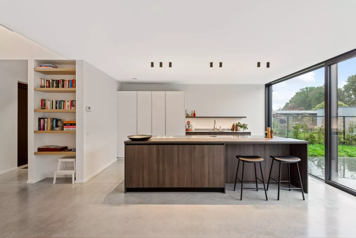 We betreden de villa via de inkomhal met gastentoilet die ons onmiddellijk brengt naar de ruime leefkeuken met een oase van licht door de grote raampartijen achteraan. Deze grote schuiframen brengen ons dadelijk naar het terras en de tuin die men naar eigen smaak nog kan invullen.