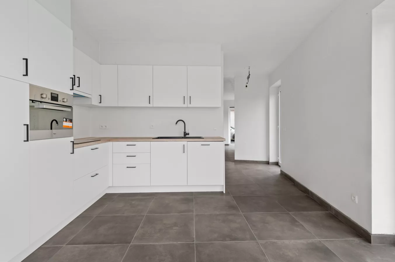 U komt de woning binnen via de inkomhal, die toegang geeft tot zowel de woonkamer als de volledig ingerichte keuken. Vanuit de keuken heeft u een heerlijk uitzicht op de aangelegde tuin en toegang tot de wasruimte alsook de garage.