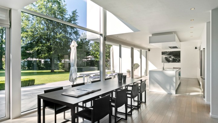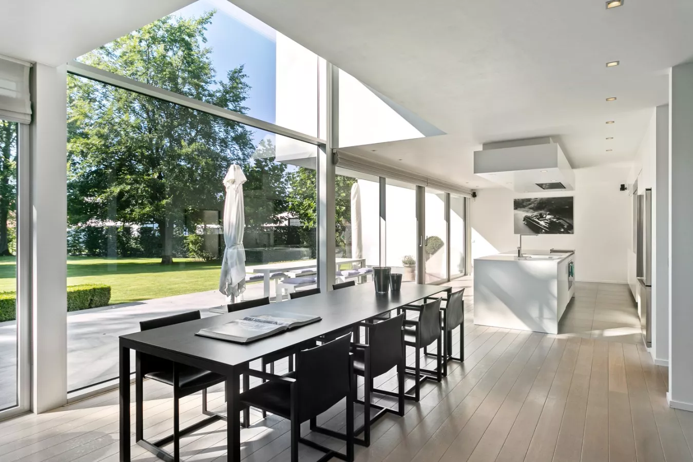Grenzend aan de leefruimte bevindt zich de eetkamer die naadloos overloopt in de stijlvolle Bulthaup keuken welke uitsluitend met premium toestellen werd ingericht en eveneens beschikt over een tweede eetgedeelte . De keuken biedt net zoals de eet- en leefruimte een open zicht op het terras en de tuin. Het zonneterras vormt een aangename plek om te toeven en meet maar liefst +/-61m².
