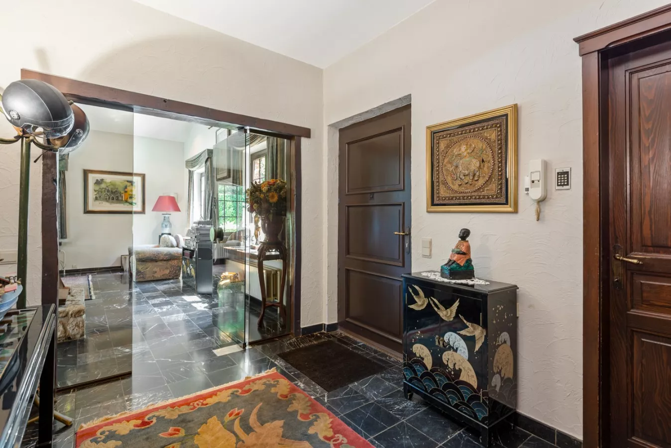 De gelijkvloerse verdieping werd voorzien van een tegelvloer. U betreedt de woning via een ruime inkomhal met aparte toegang naar de garage. De leefruimte wordt gevormd door een salongedeelte met grote open haard + schouw en eetgedeelte met aansluitend de ingerichte keuken. Vanuit de leefruimte krijgen we toegang tot de zéér ruime veranda, die uitgerust is met vloerverwarming en airco.