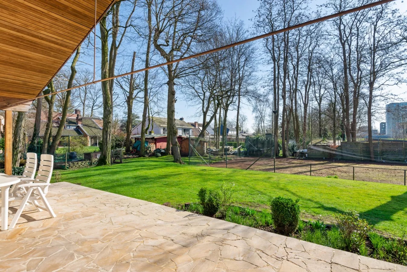 De woning beschikt over een prachtige zuid en zuidwest georiënteerde tuin met zicht op het kanaal en jaagpad, ideaal voor de warme zomerdagen. Bijkomend is een gravel tennisveld aanwezig. Het tennisveld voegt een element van recreatie toe, perfect voor sportliefhebbers en gezinnen die graag buiten actief zijn.