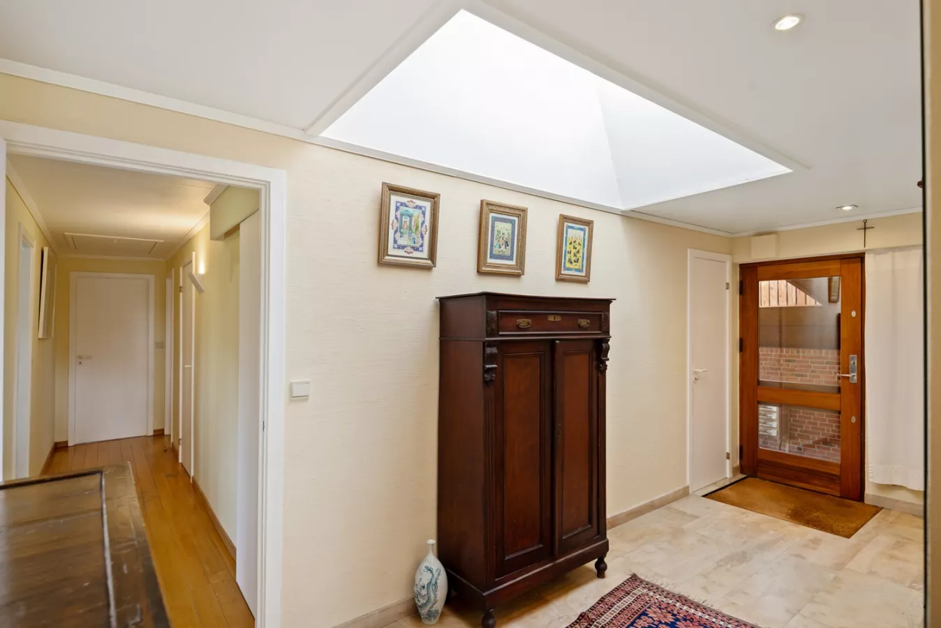 U betreedt de woning via de inkomhal. Deze leidt naar de lichtrijke leefruimte (54m²) en eetkamer met travertijn vloertegels. Verder bevindt zich de volledig uitgeruste keuken met koelkast, oven, keramische kookplaat, ingemaakte kasten, dubbele spoelbak en vaatwasser. Aansluitend bij de keuken is een berging met aansluiting voor wasmachine, droogkast en een tweede inkomdeur. Via de berging heeft u toegang tot de garage. De garage (26m²) is uitgerust met een houten automatische kantelpoort en een aparte deur die toegang verleend tot de tuin.