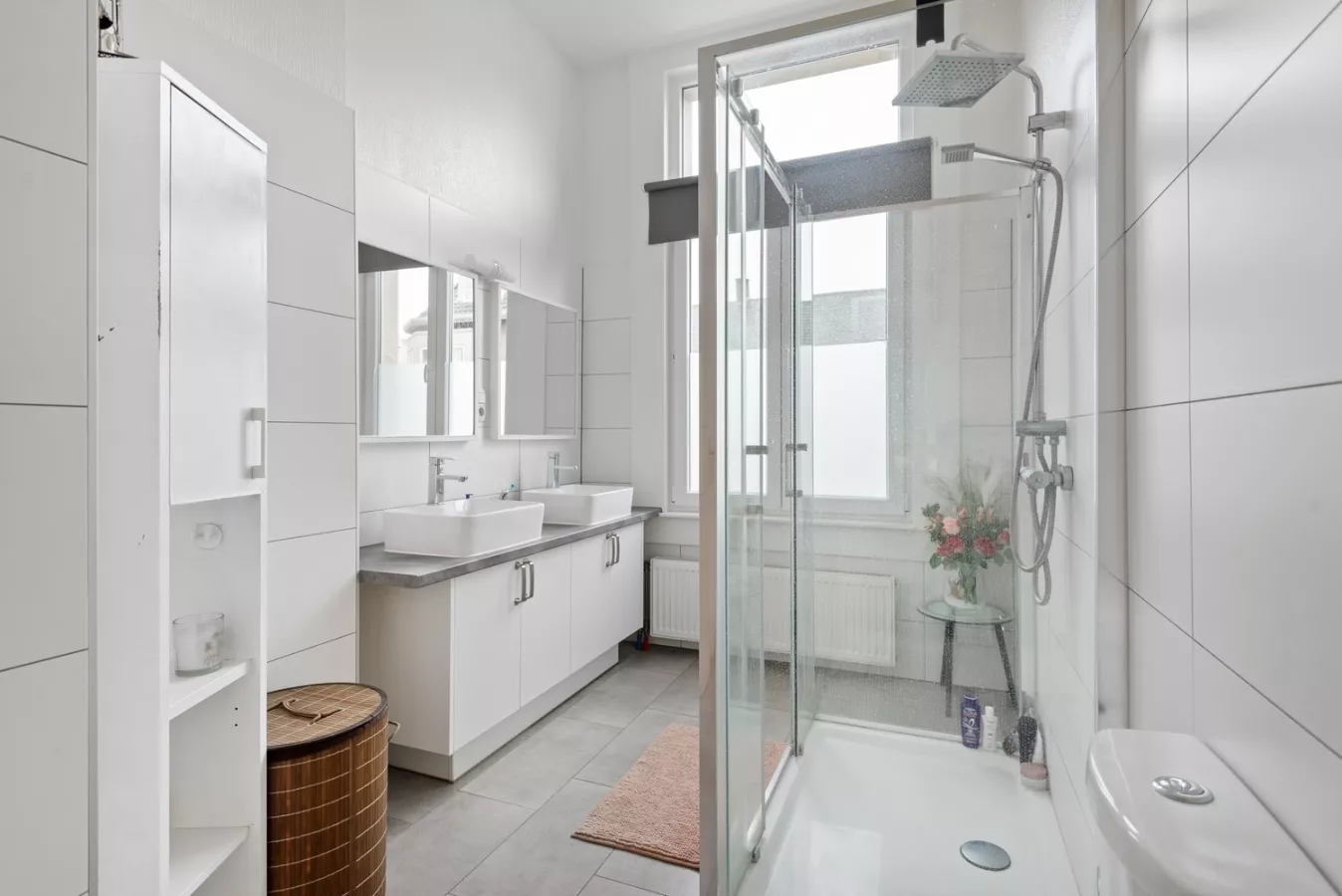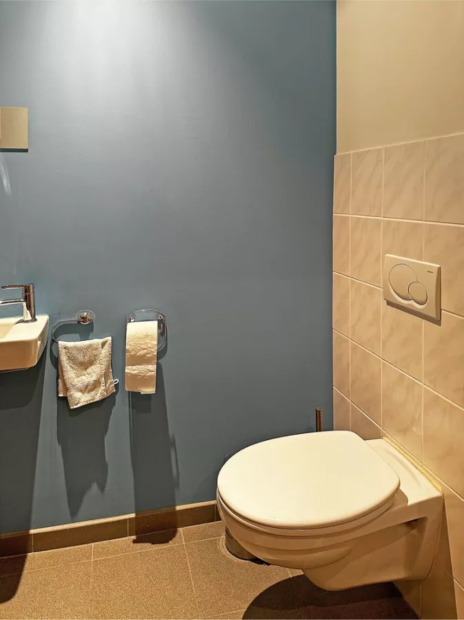 De badkamer is uitgerust met een douchecabine, dubbele spoelbak in meubel en een toilet. Aan de badkamer is ook een berging met de Vaillant ketel.