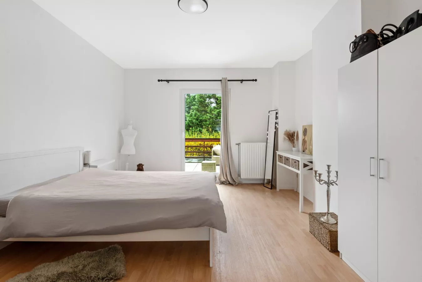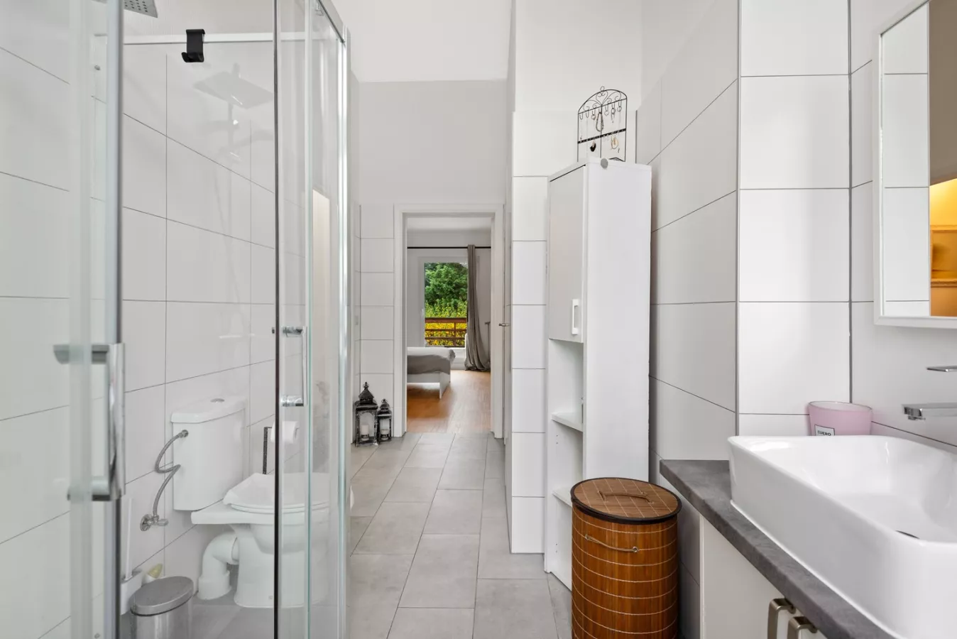 Terug in de inkomhal, gaat u naar links. Daar bevindt u zich in de badkamer met aansluitend de slaapkamer en een tweede toegang tot het terras.