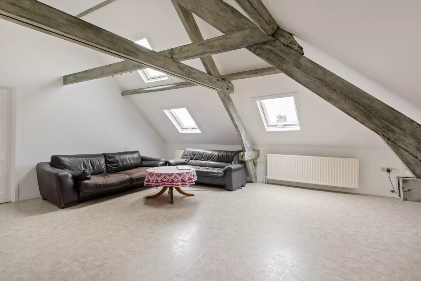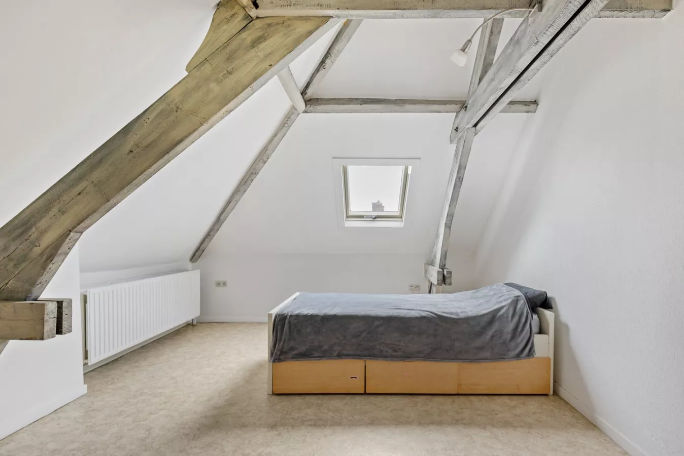 Bijkomend bevindt zich een lichtrijk en ruim 1 slaapkamer dakappartement op de tweede verdieping. U komt daarbij binnen in de leefruimte met aansluitend de keuken. In de keuken is er een keramische kookplaat, dampkap, enkele spoelbak en met kasten bovenaan en onderaan voorzien. Verder is er nog een grote slaapkamer (22.6m²) met aansluitend de badkamer. Deze badkamer is uitgerust met een ligbad met douchesproeier, staan toilet, aansluiting voor de wasmachine en een radiator.