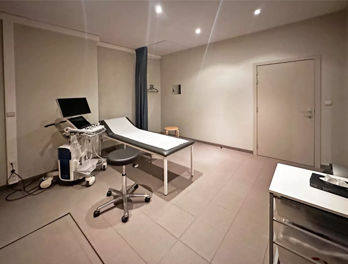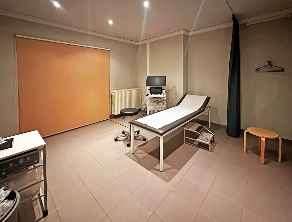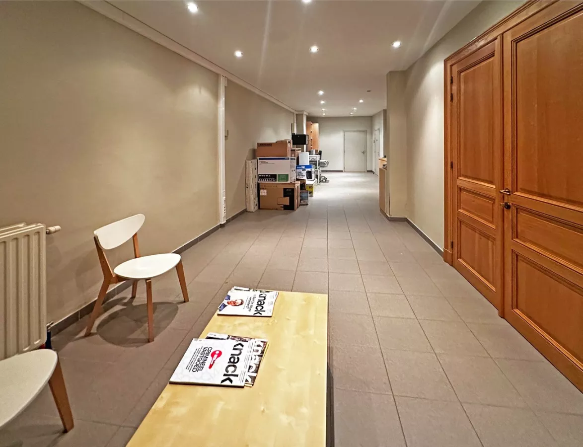 Als u het gebouw binnenkomt, bevindt u zich in de gemeenschappelijke inkomhal. Als u door de dubbele houten deuren aan de linkerkant gaat, komt u in de wachtruimte/ onthaal. In deze ruimte zit er ook een apart toilet. Verder naar achteren, ziet u de eerste bureau met een privatief terras. Naast deze bureau, is een tweede bureau ruimte met een aanhorend privatief terras.