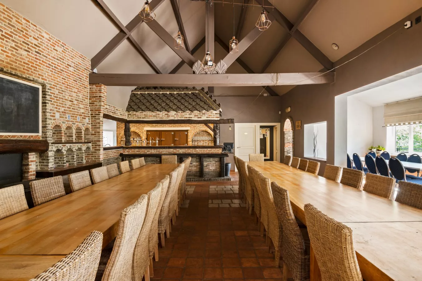 Een gezellige bar verbindt deze zalen met de keuken en bijkeuken.