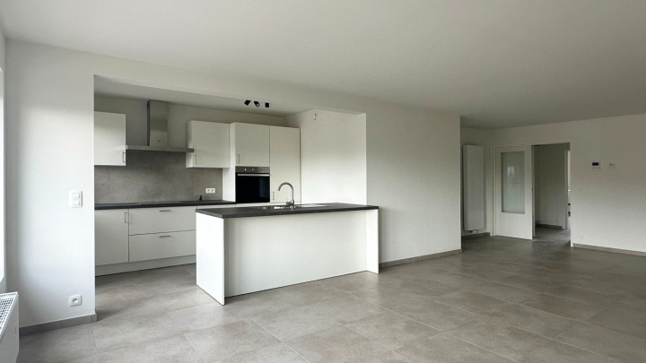 We betreden het appartement via de inkomhal die uitgeeft op de riante leefruimte. Deze mooie, open ruimte met veel lichtinval loopt naadloos door naar de open, volledig geïnstalleerde keuken. Naast de keuken bevindt zich nog een praktische bergruimte alsook hebben we toegang tot het eerste terras.
