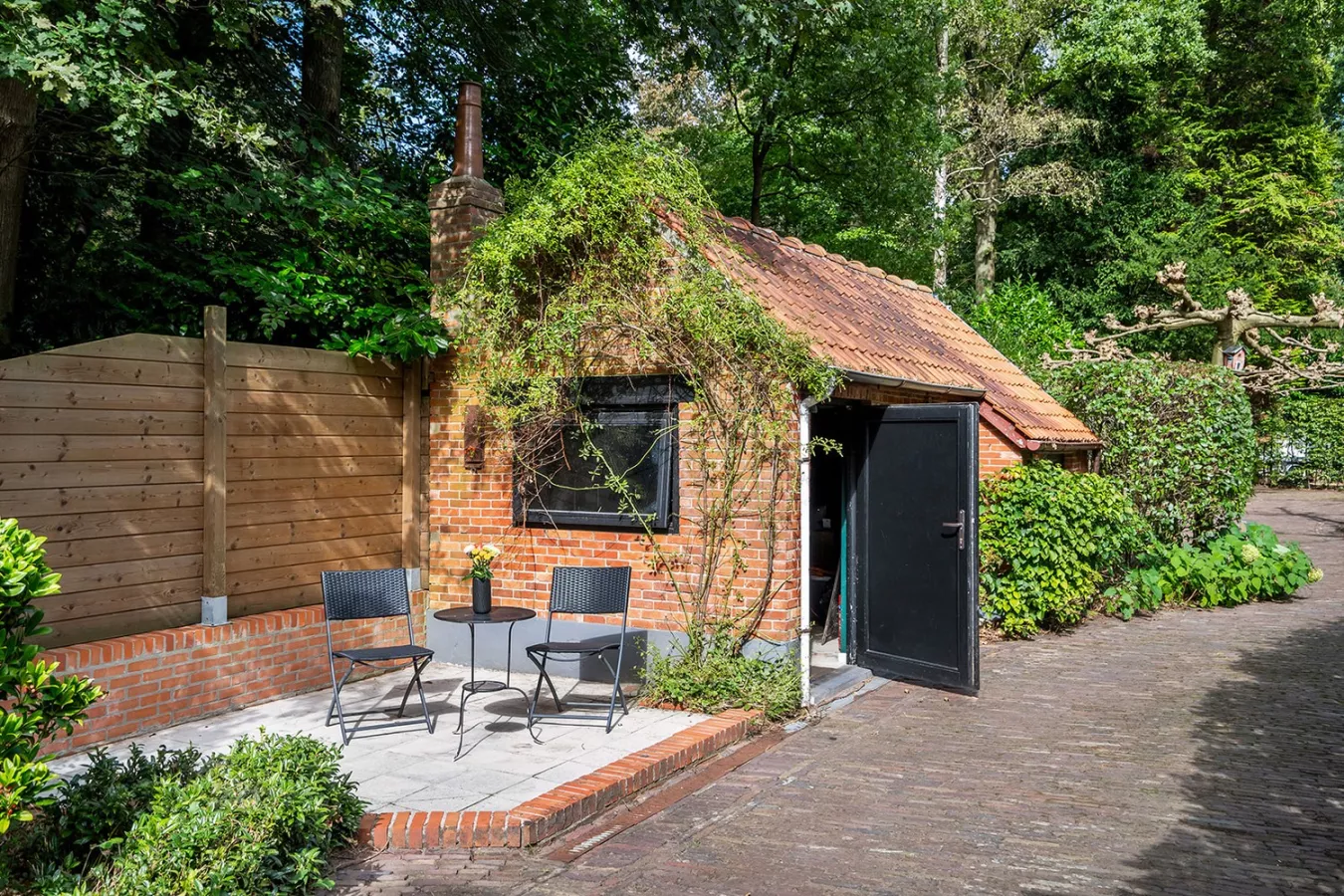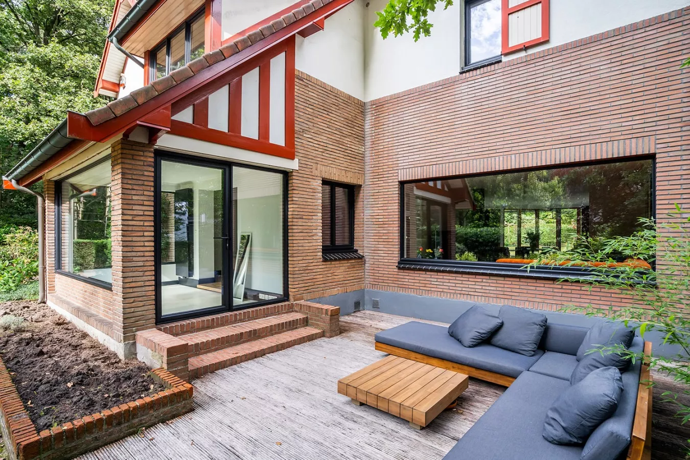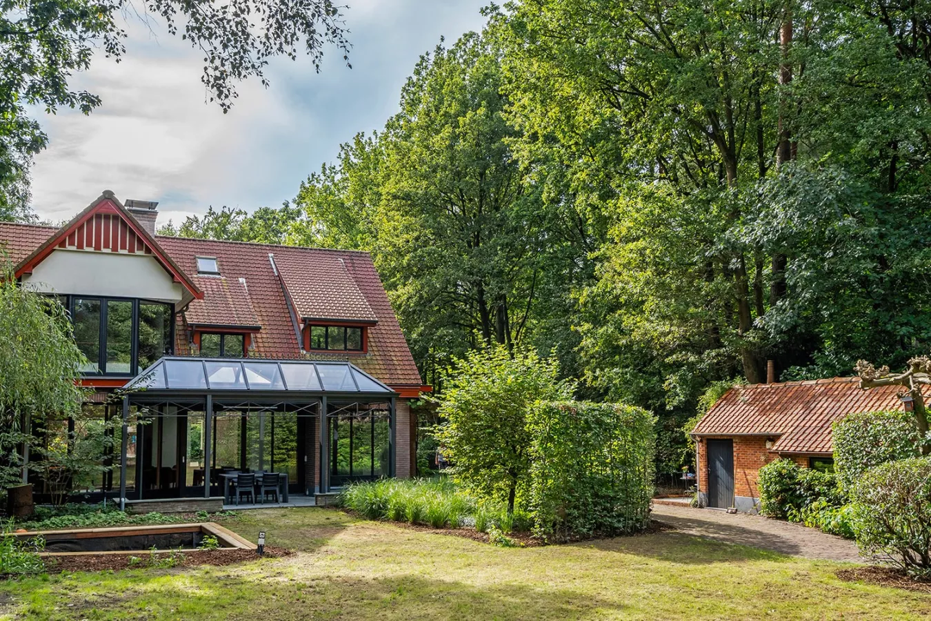 De villa wordt omgeven door een uitgestrekte, prachtig aangelegde tuin met een royaal terras, ideaal voor al fresco dineren, zonnebaden of gewoon genieten van de rust en sereniteit van de buitenruimte. Het eerste bijgebouw werd ingericht om dienst te doen als praktijk- of fitnessruimte of thuiskantoor. Het bijgebouw achteraan biedt extra opslagruimte of kan worden omgevormd tot poolhouse.