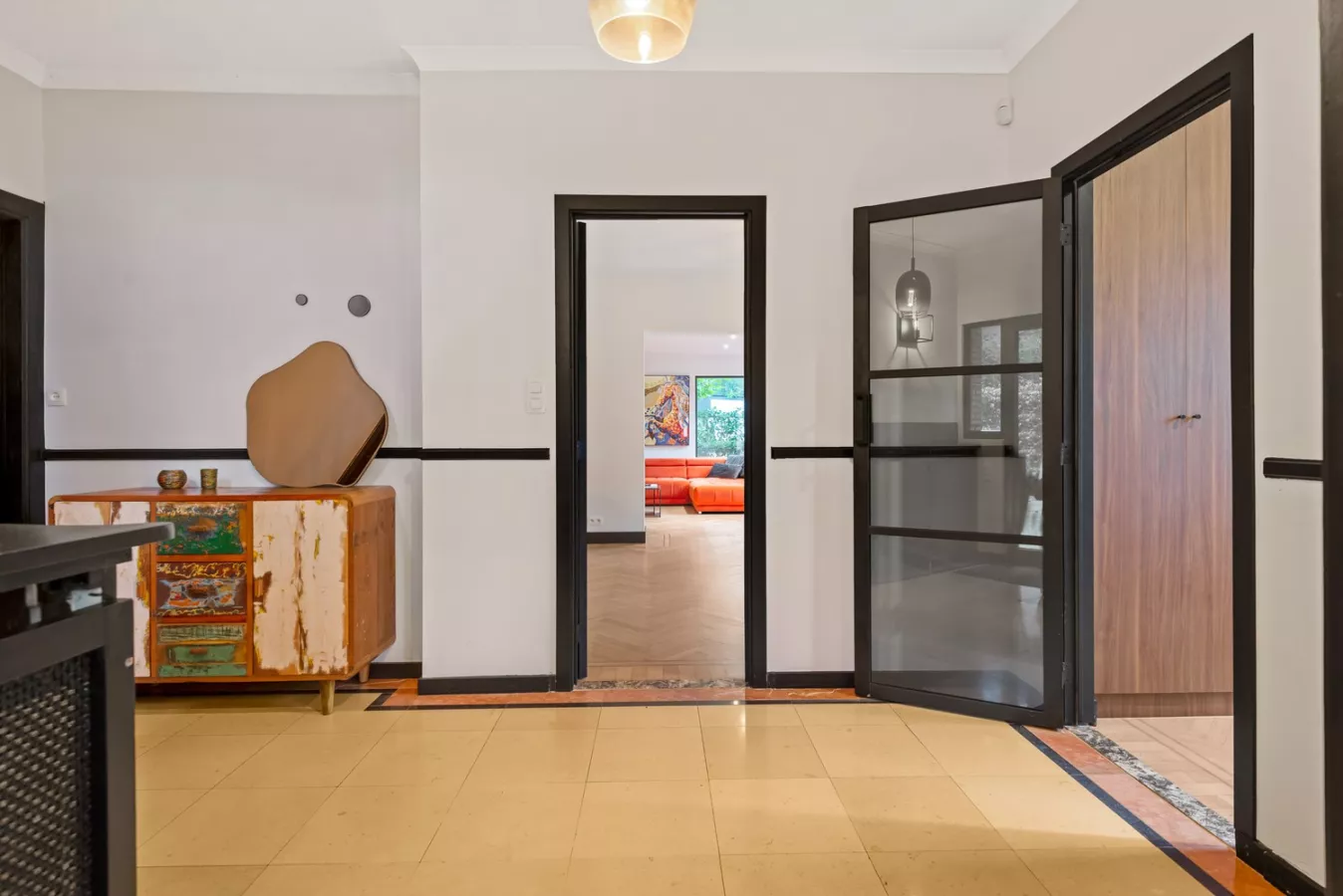 U betreedt de villa via de mooie inkom met een prachtige authentieke tegel, deze brengt u in de ontvangstruimte. Deze is smaakvol ingericht met visgraatparket die een warm en uitnodigend gevoel geeft. De grote raampartijen laten overvloedig natuurlijk licht binnenstromen, waardoor de ruimte nog helderder en luchtiger aanvoelt. Hiernaast bevindt zich de riante leefruimte met openhaard dewelke een uiterst gezellige sfeer creëert.