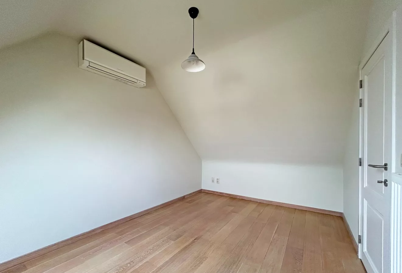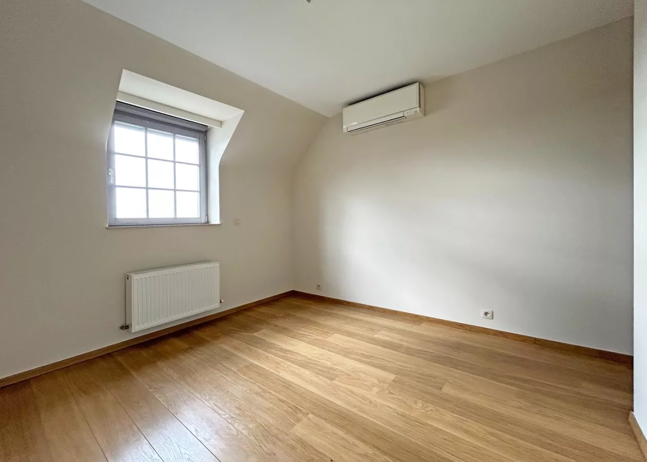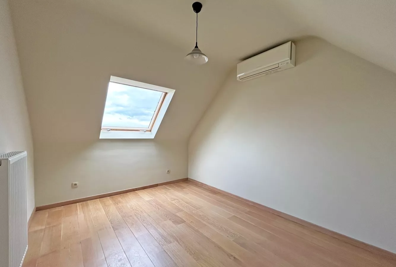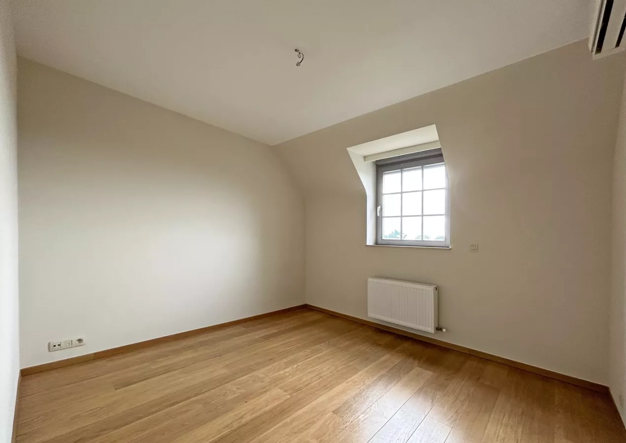 Vervolgens bevindt er zich een toilet, een badkamer welke is uitgerust met een inloopdouche, een dubbele lavabo, een spiegelkast en een handdoekdroger. De slaapkamer (13,5m² ) en bureau/dressing (8,5m²) beschikken over een mooie, houten vloer en de bureauruimte is voorzien van ingemaakte kasten. In deze kasten bevinden zich aansluitingen voor een wasmachine en droogkast.