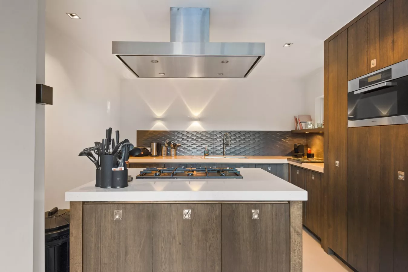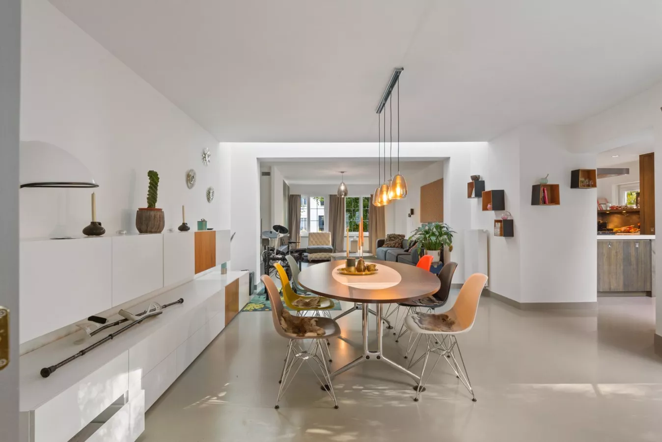 We betreden de woning via de inkomhal met apart toilet en vestiaire die uitgeeft op een lichtrijke bureau die toegang geeft tot de mooie, open leefruimte voorzien van een stijlvolle gietvloer. Deze ruimte geniet tevens van enorm veel lichtinval en loopt naadloos door naar de volledig geïnstalleerde, open keuken met leuk kookeiland en toegang tot de zonnige tuin.