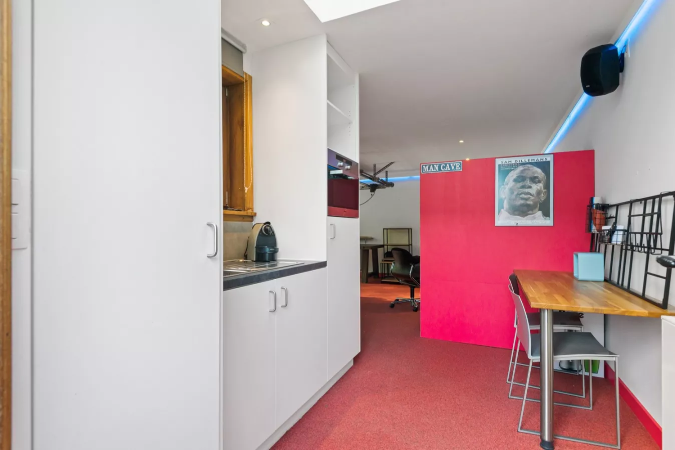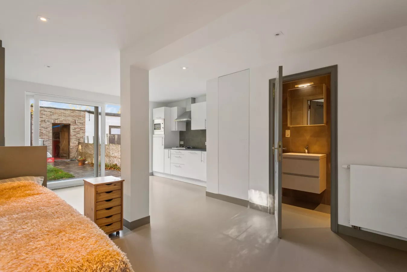 Achteraan werd een leuke studio voorzien die is uitgerust met een apart toilet, een berging, een eigen badkamer en een leefruimte met open keuken. Via de schuifdeur achteraan is de gezellige tuin bereikbaar.