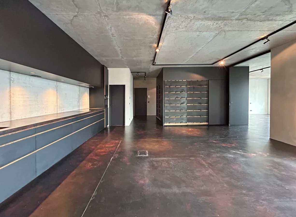De industriële afwerking van dit kantoor is uniek dankzij de combinatie van een donkerbruine gietvloer, blootgestelde beton muren en een in hout gewikkelde middenconsole.