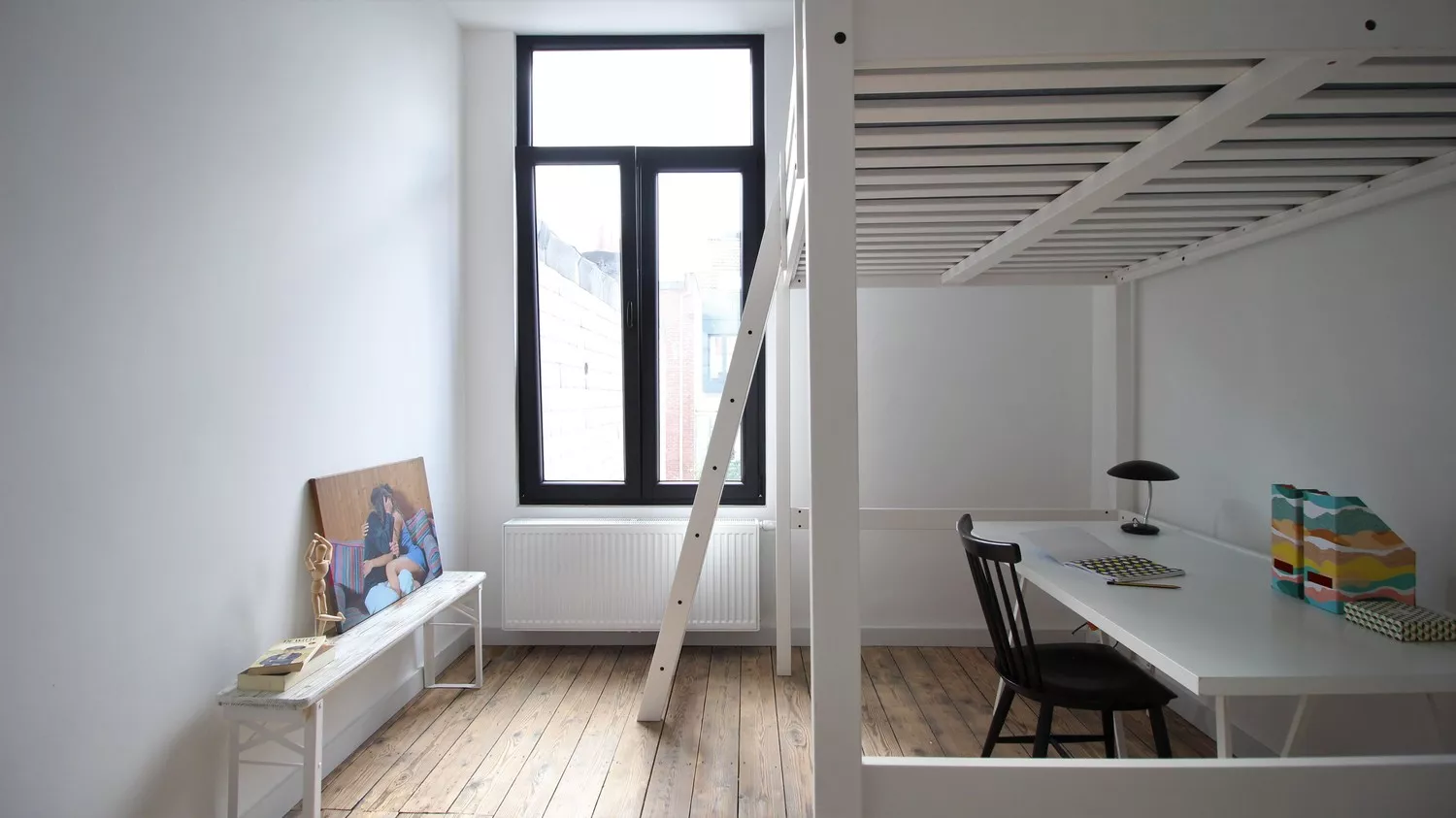 Deze studentenkamer bevindt zich aan de achterzijde van het gebouw en beschikt reeds over een hoogslaper.
