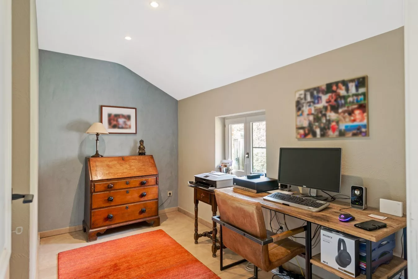 U betreedt de villa via de mooie inkom met vestiaire. Rechts van de inkom bevindt zich de bureauruimte. Verder komt u terecht in de leefruimte. Deze is smaakvol ingericht met natuursteenvloer die uitnodigend gevoel geeft. De grote ramen laten overvloedig natuurlijk licht binnenstromen. Bijkomend is de leefruimte uitgerust met een openhaard welke een uiterst gezellige sfeer creëert.