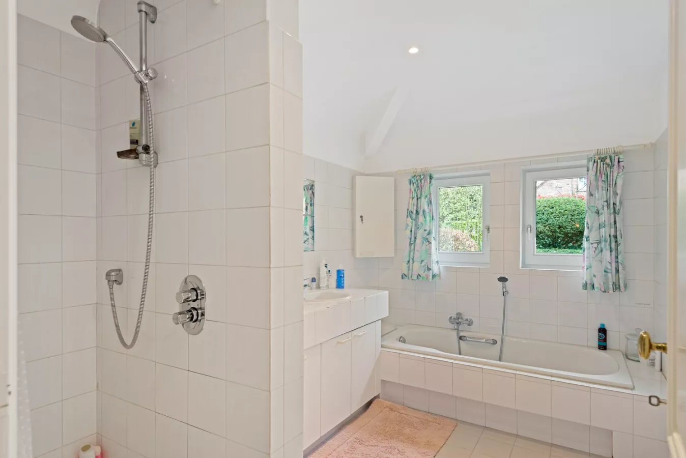 Naast de derde kamer is een bijkomende badkamer voorzien. Deze is uitgerust met een ligbad, douche en dubbele lavabomeubel. Elke slaapkamer is zorgvuldig ontworpen en heeft toegang tot de zonnige tuin. Op de eerste verdieping bevindt zich de ruime slaapkamer (17.5m²) met ensuite badkamer en dressing.