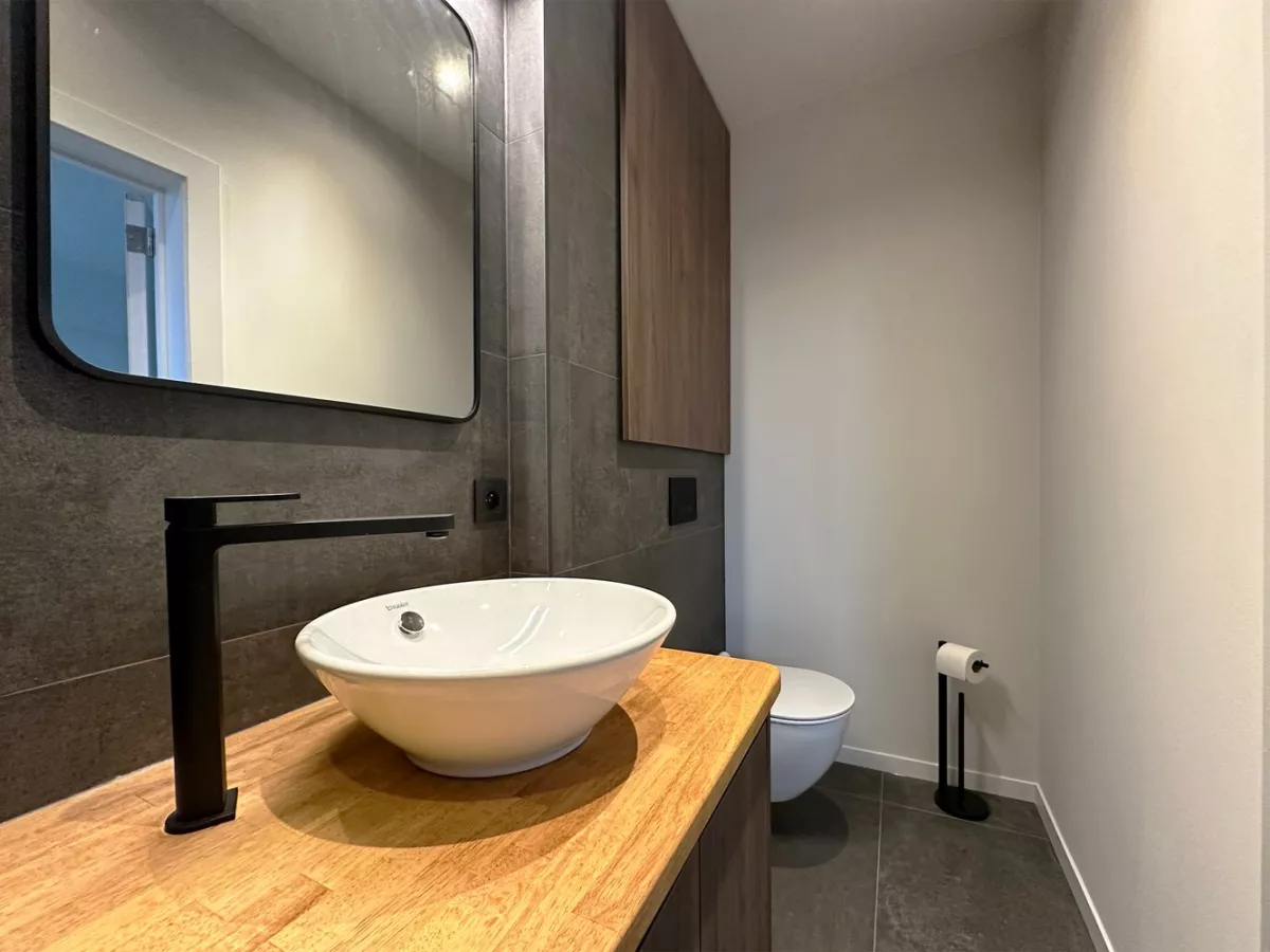 Vooraan situeert zich de ruime woonkamer met volledig ingerichte open keuken. Deze ruimte geniet veel lichtinval.