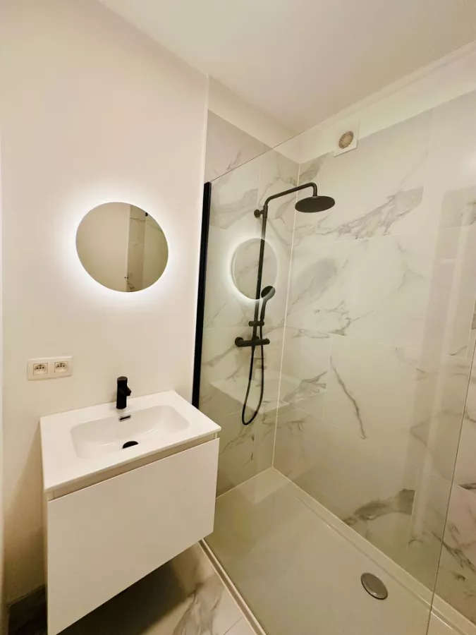 Eens terug in de inkomhal vind je een ingemaakte vestiairekast, een apart toilet met handenwasser, alsook de toegang tot de badkamer. De badkamer zelf is voorzien van een aangename inloopdouche, een lavabomeubel en spiegel met verlichting, alsook een sierradiator voor handdoeken.