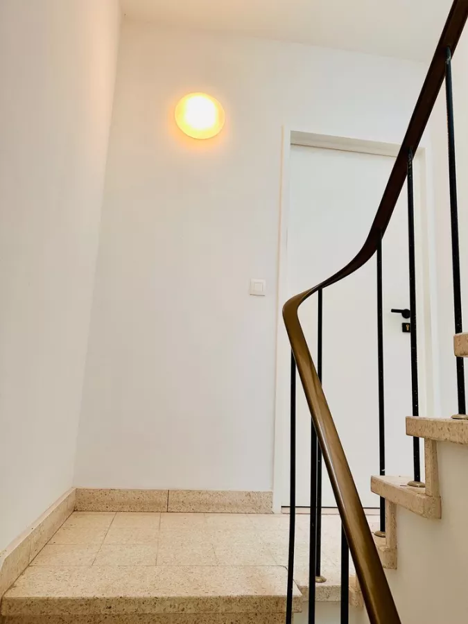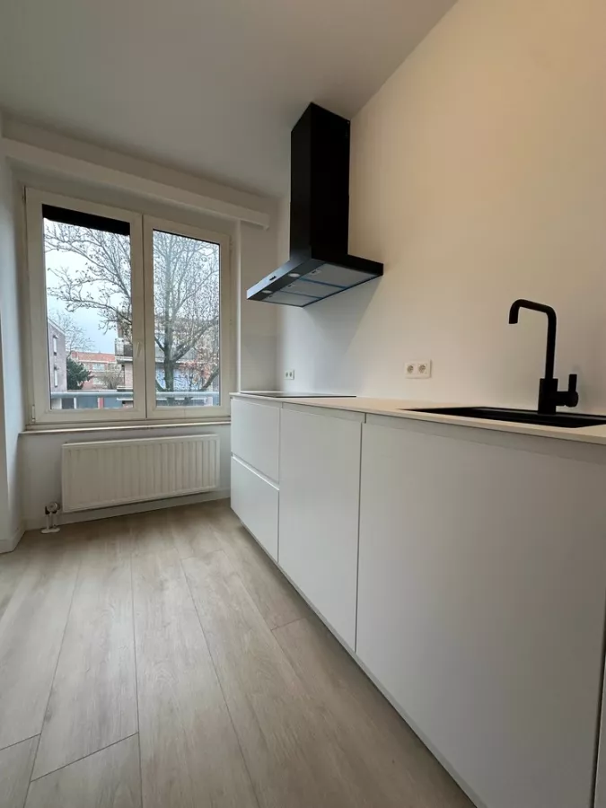 U betreedt het appartement via een aangename inkomhal die toegang geeft tot de riante en lichtrijke leefruimte (+/-31m²). Grenzend aan de leefruimte vind je een volledig vernieuwde en geïnstalleerde keuken, welke is voorzien van alle toestellen: inductiekookplaat, dampkap, spoelbak met mengkraan, combi-oven alsook tal van kasten. Achteraan bevindt zich een ingemaakte berging welke werd voorzien van een aansluiting voor wasmachine en droogkast.