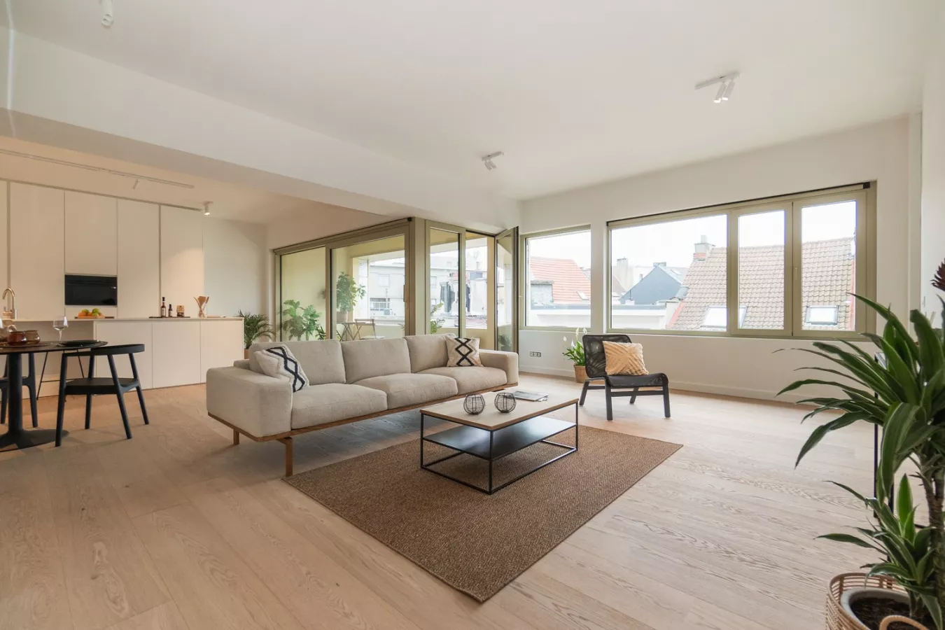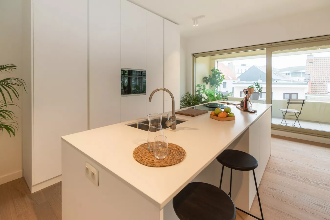 Dit appartement ligt op de tweede verdieping, toegankelijk met lift of trap. De inkomhal met vestiaire en gasten toilet, komt uit op de woonkamer met keuken en aparte berging. De keuken is een volledig uitgeruste moderne keuken met eiland, voorzien van een combi-oven, spoeltafel en vaatwasmachine. Grenzend aan de woonkamer kan u een ruim terras terugvinden.
