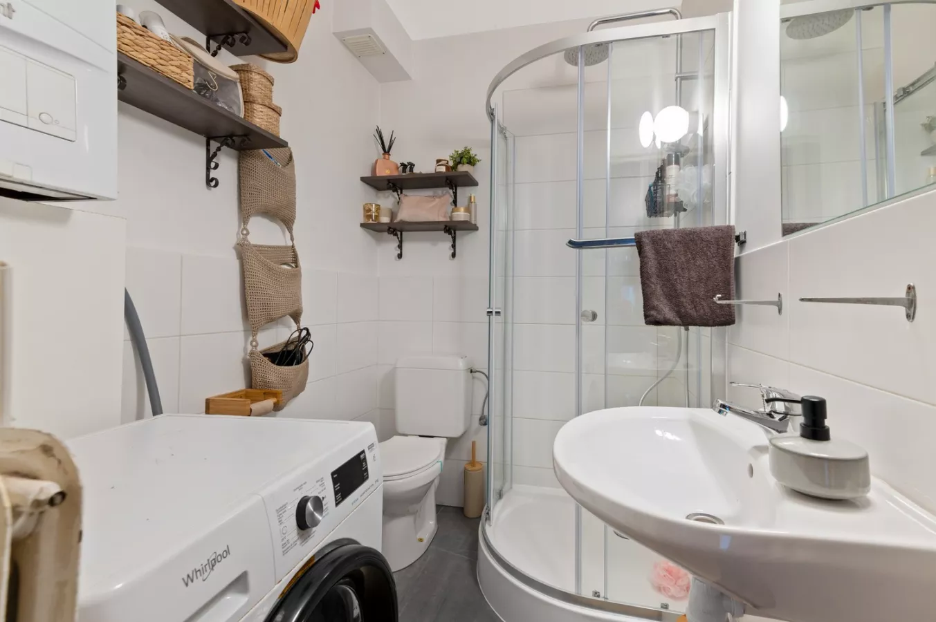 De badkamer is uitgerust met een een douchecabine en een dubbel lavabomeubel. In de badkamer is tevens aansluiting voor wasmachine en droogkast.