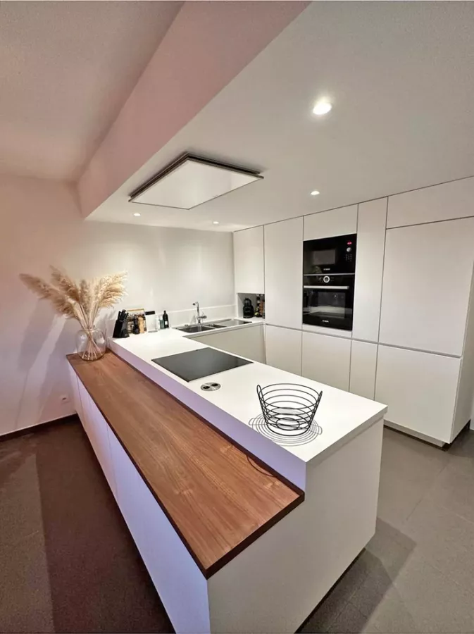 We betreden het appartement via de inkomhal die uitgeeft op de ruime leefruimte met open keuken. Naast deze volledig ingerichte keuken bevindt zich een bergruimte met aansluiting was- en droogmachine.