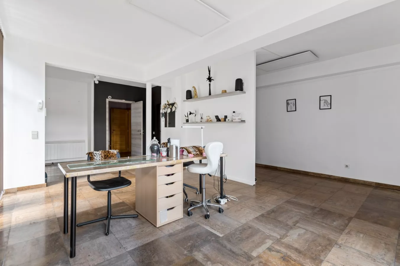 We betreden de woning via de inkomhal. Deze leidt ons naar een handige bureauruimte en polyvalente ruimte, momenteel ingericht als schoonheidsinstituut.