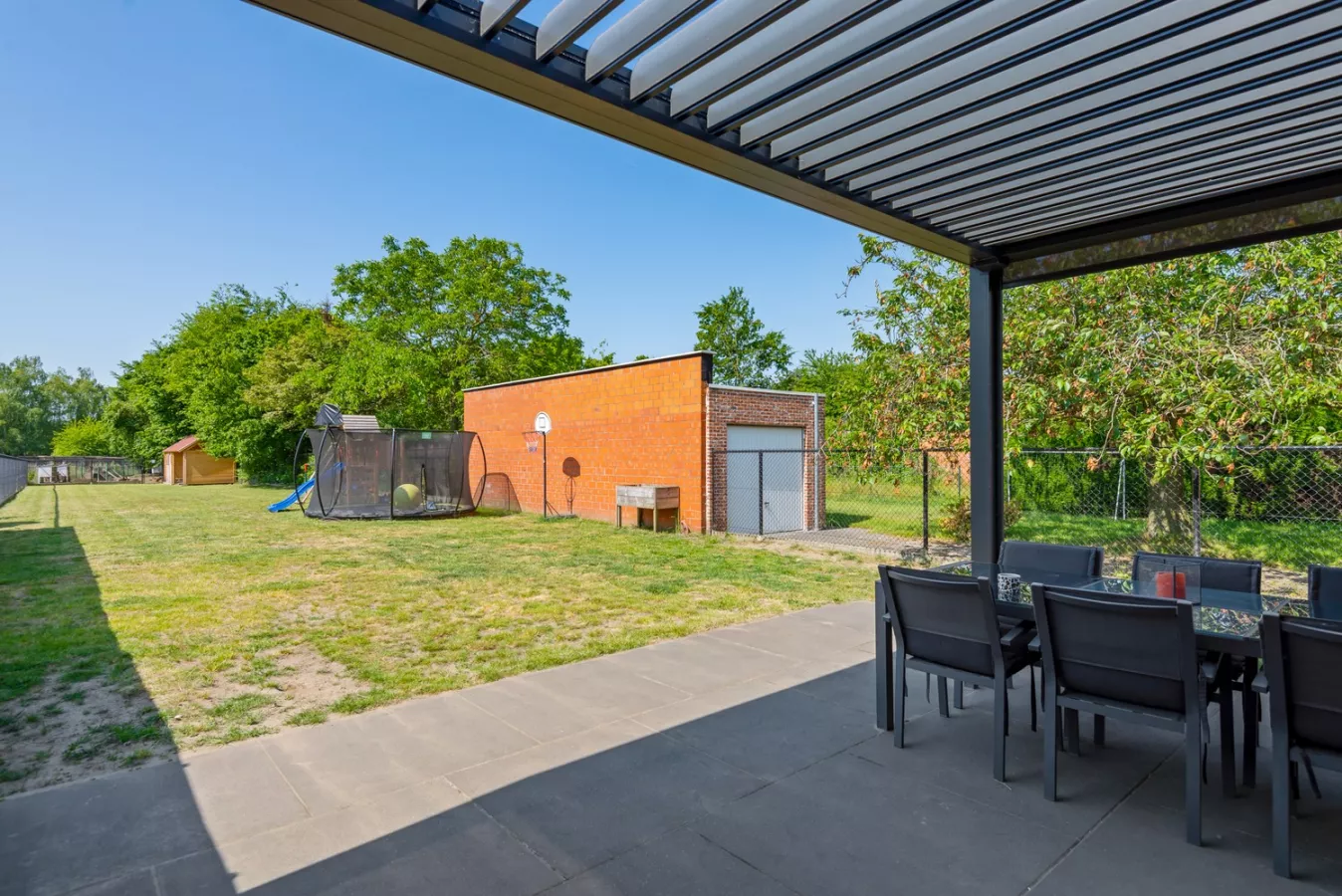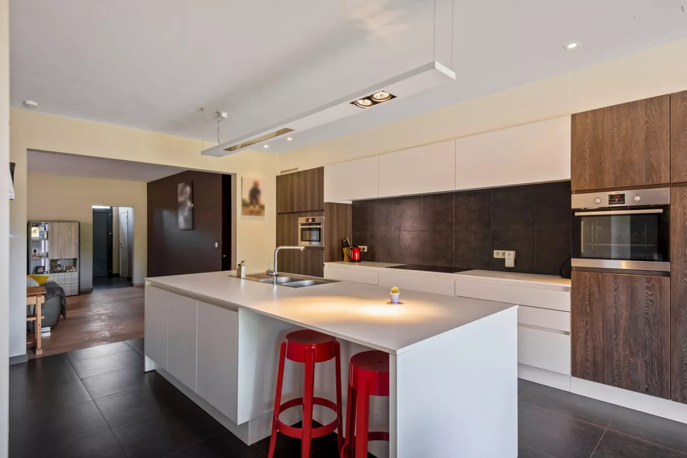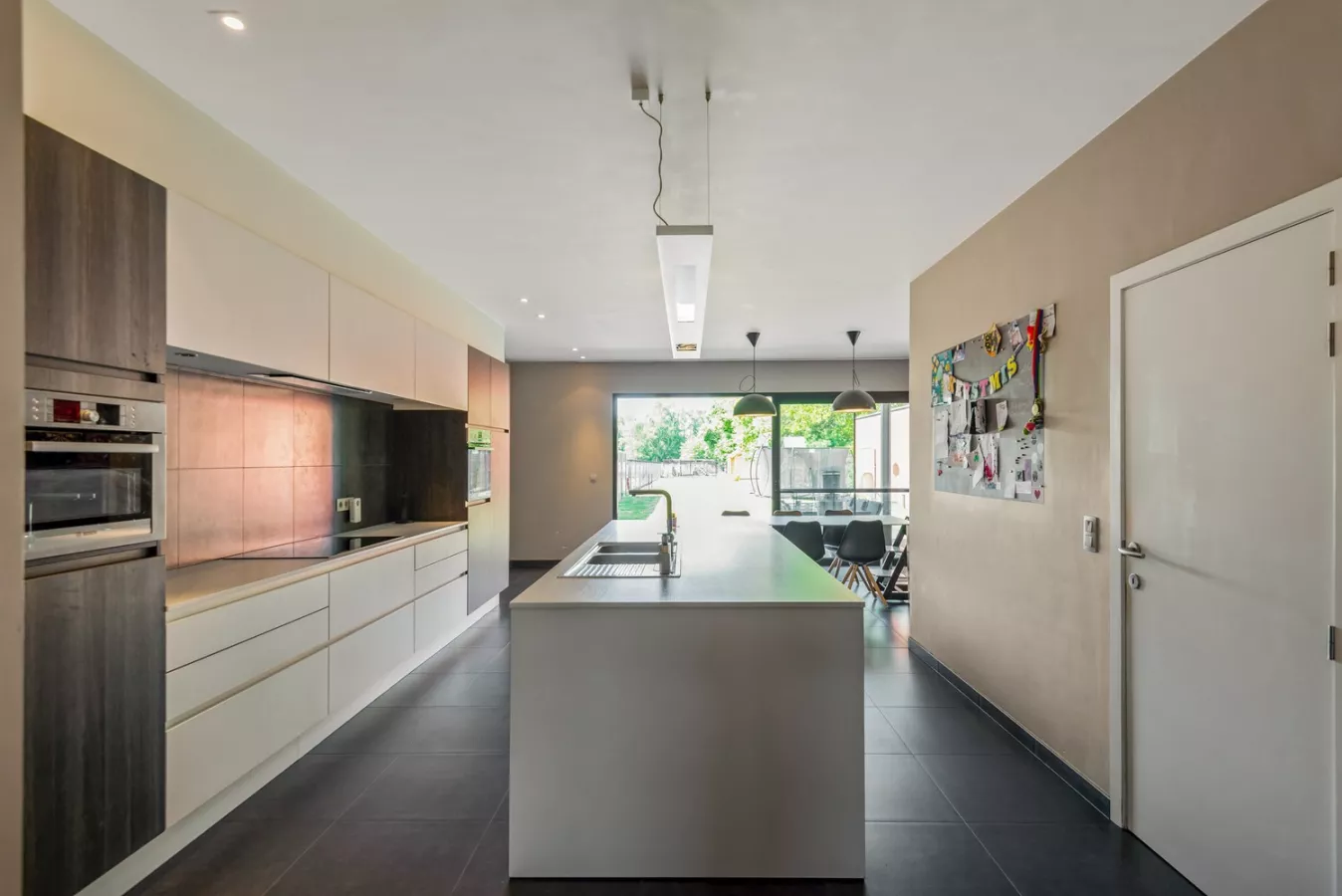 De keuken en eetruimte genieten van veel natuurlijk daglicht door het grote schuifraam achteraan de woning welk toegang geeft tot het overdekt terras met zonnewering en de prachte tuin. Verder bevindt zich naast de woonkamer nog een bureauruimte. Het gelijkvloers beschikt over vloerverwarming.