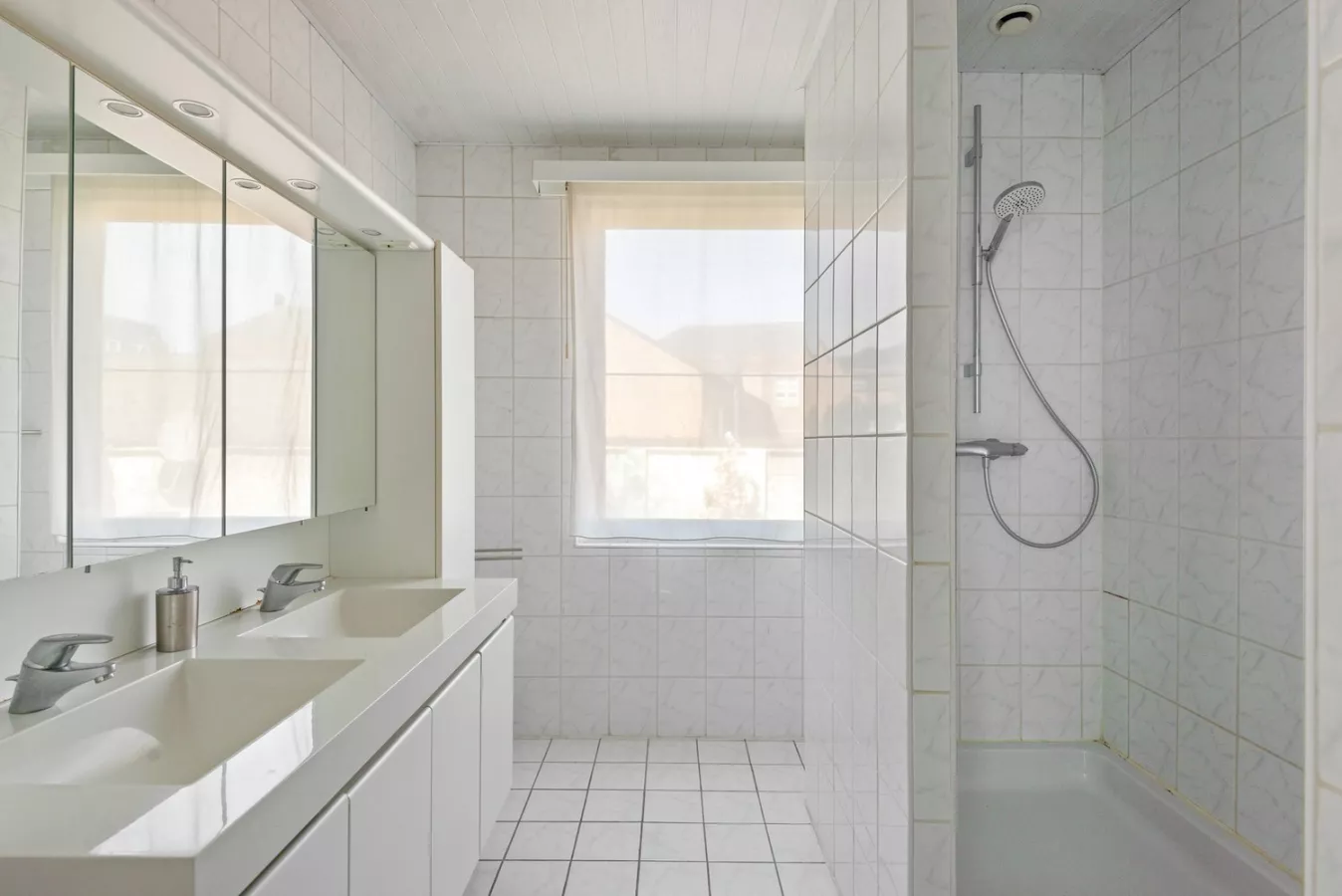 Op de tussenverdieping bevindt zich een tussenkamer met directe toegang tot de badkamer, uitgerust met douche en een dubbele lavabo in een praktisch badkamermeubel. Op deze verdieping is er ook een apart toilet.