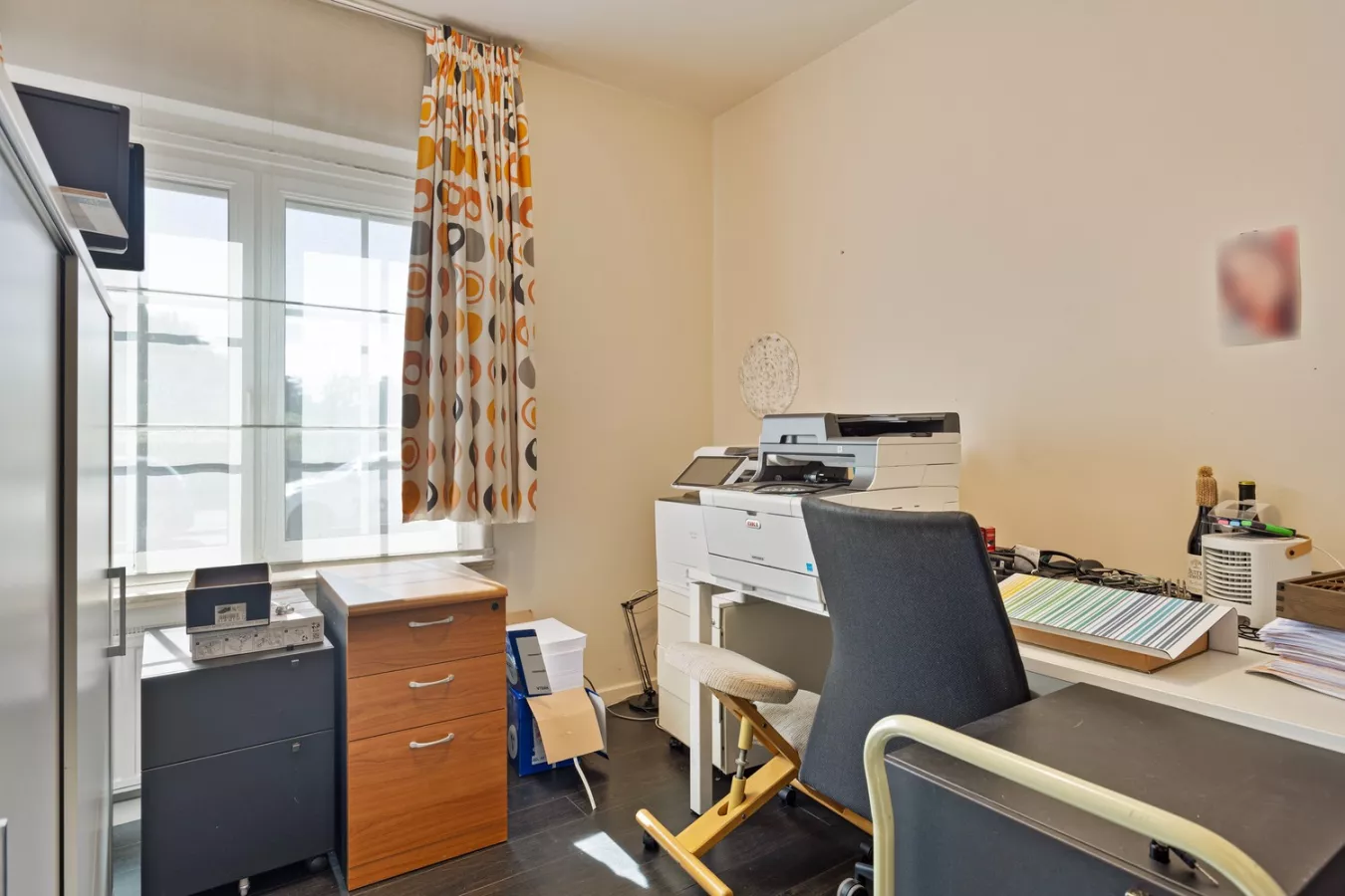 De inkom met bureau (of slaapkamer), vestiaire en gastentoilet, brengt ons dadelijk via een dubbele glazen deur naar de ruime en lichtrijke leefruimte, waar de gezellige zithoek met open haard en de aangename eetkamer in open verbinding staan. Dankzij de grote raampartijen voor- en achteraan baadt de leefruimte in natuurlijk licht, wat bijdraagt aan een warme en huiselijke sfeer.