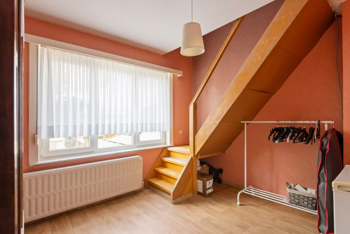 De doorloopkamer op de eerste verdieping brengt ons naar de tweede verdieping. Deze ruimte kan polyvalent omgevormd worden tot bijvoorbeeld een dressing of een bureau.