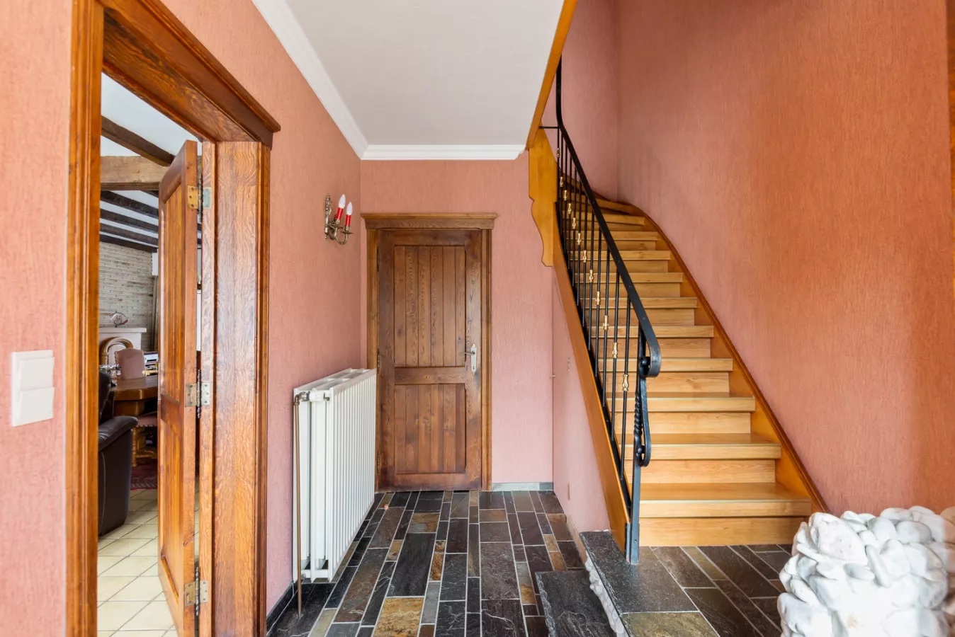 De inkomhal geeft toegang tot de ruime woonkamer met enorm veel lichtinval door de grote raampartijen zowel vooraan als achteraan.
