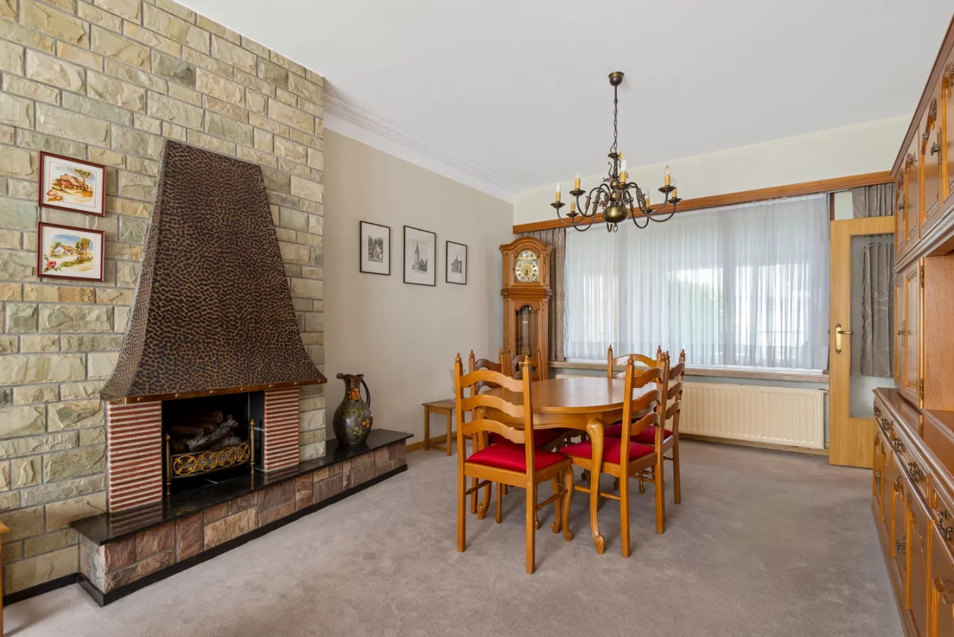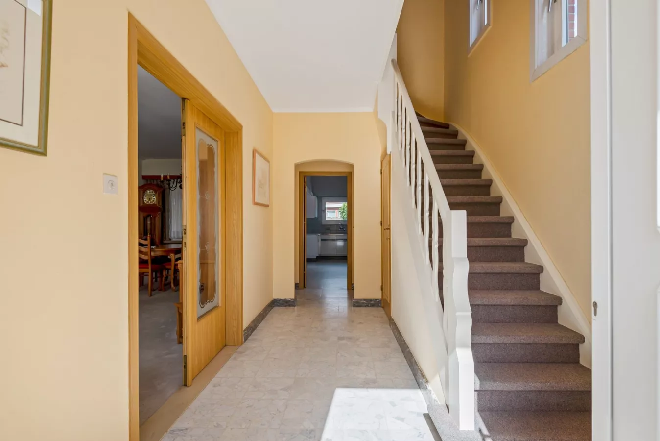 We betreden de woning via de inkomhal met apart toilet die enerzijds uitgeeft op de ruime, gezellige leefruimte en anderzijds op de keuken met veel natuurlijk lichtinval. De keuken loopt door naar de lichtrijke veranda met twee aparte bergruimtes. Vanuit de veranda hebben we toegang tot de leuke tuin met terras alsook tot de ruime garage met grote oprit.