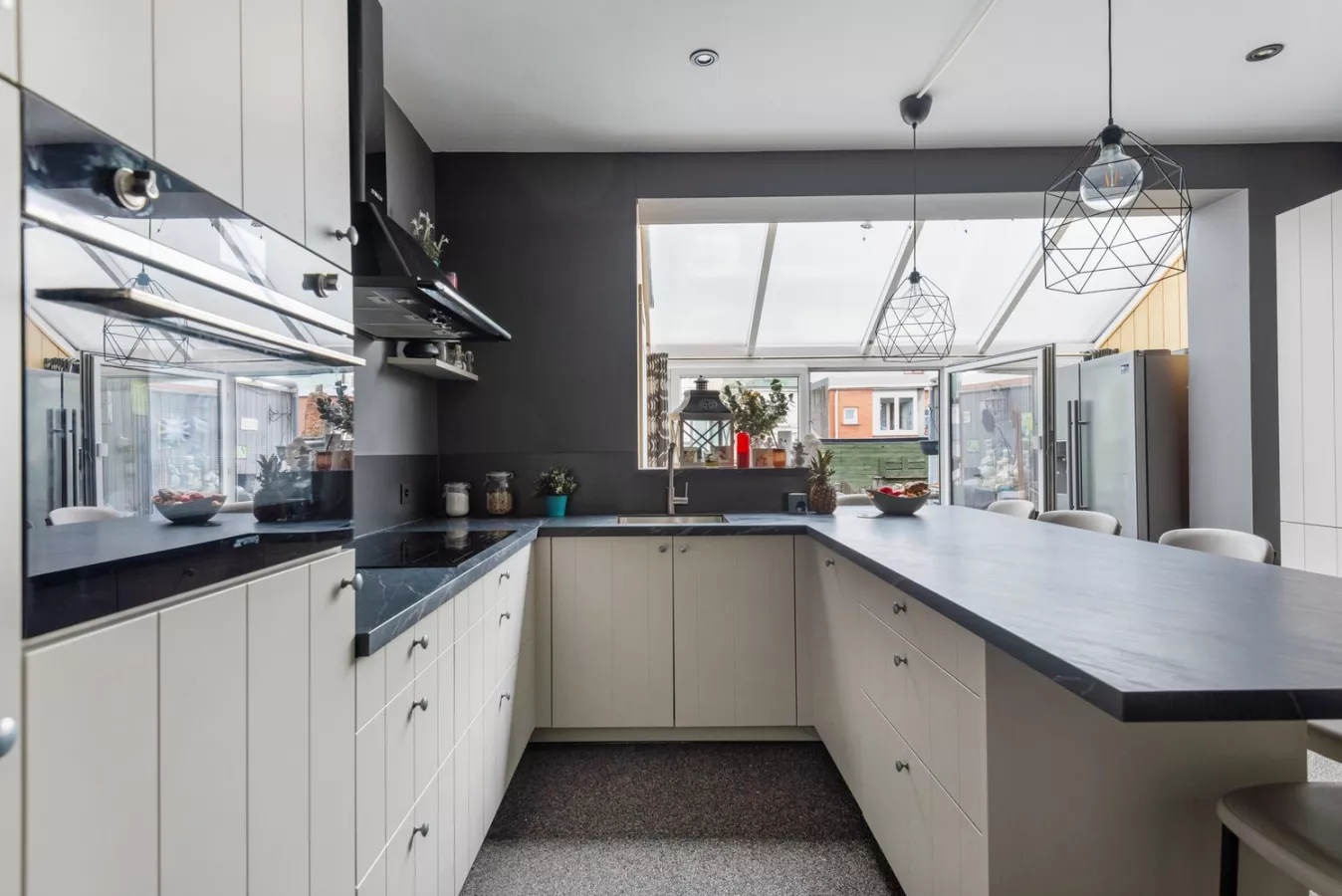 Op de gelijkvloers bevindt zich de ruime leefruimte met aansluitend de prachtige, gezellige, open keuken. De sterk uitgeruste keuken dient eveneens als zitruimte en is voorzien van al de nodige SMEG toestellen. Deze geeft uit op de tuin met terras waar het aangenaam vertoeven is tijdens de zomermaanden.