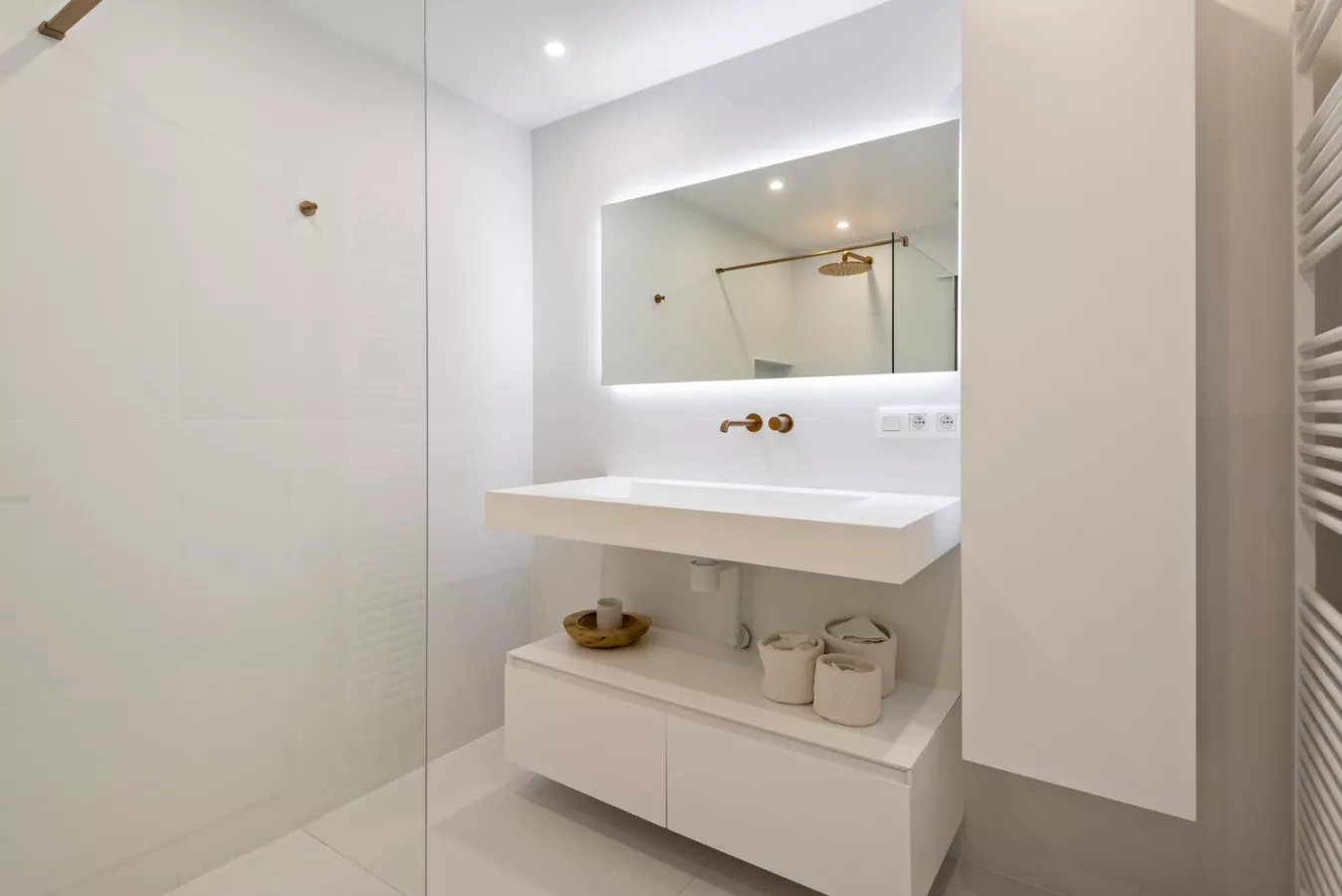 De studio beschikt nog over een badkamer voorzien van een hangtoilet, lavabo, douche en handdoekendroger en een wasplaats.